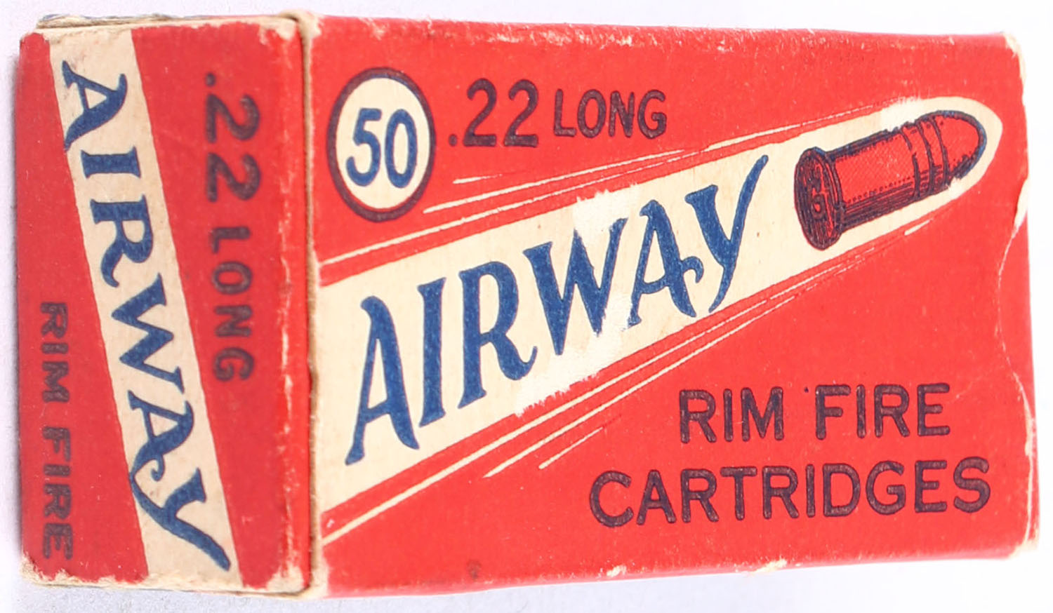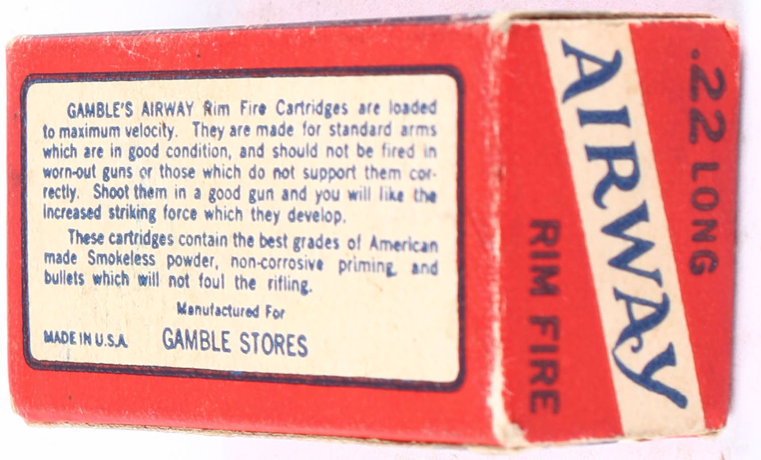 Gambles, Airway, .22 Long, RHWeb: GS-1 L-1c, Full, 1pc., red white & blue box, box is solid with excellent color, some age soiling & corner wear, minor edge wear, end flaps are solid, ammo is excellent. Grade: Excellent - Value: 30 to 100