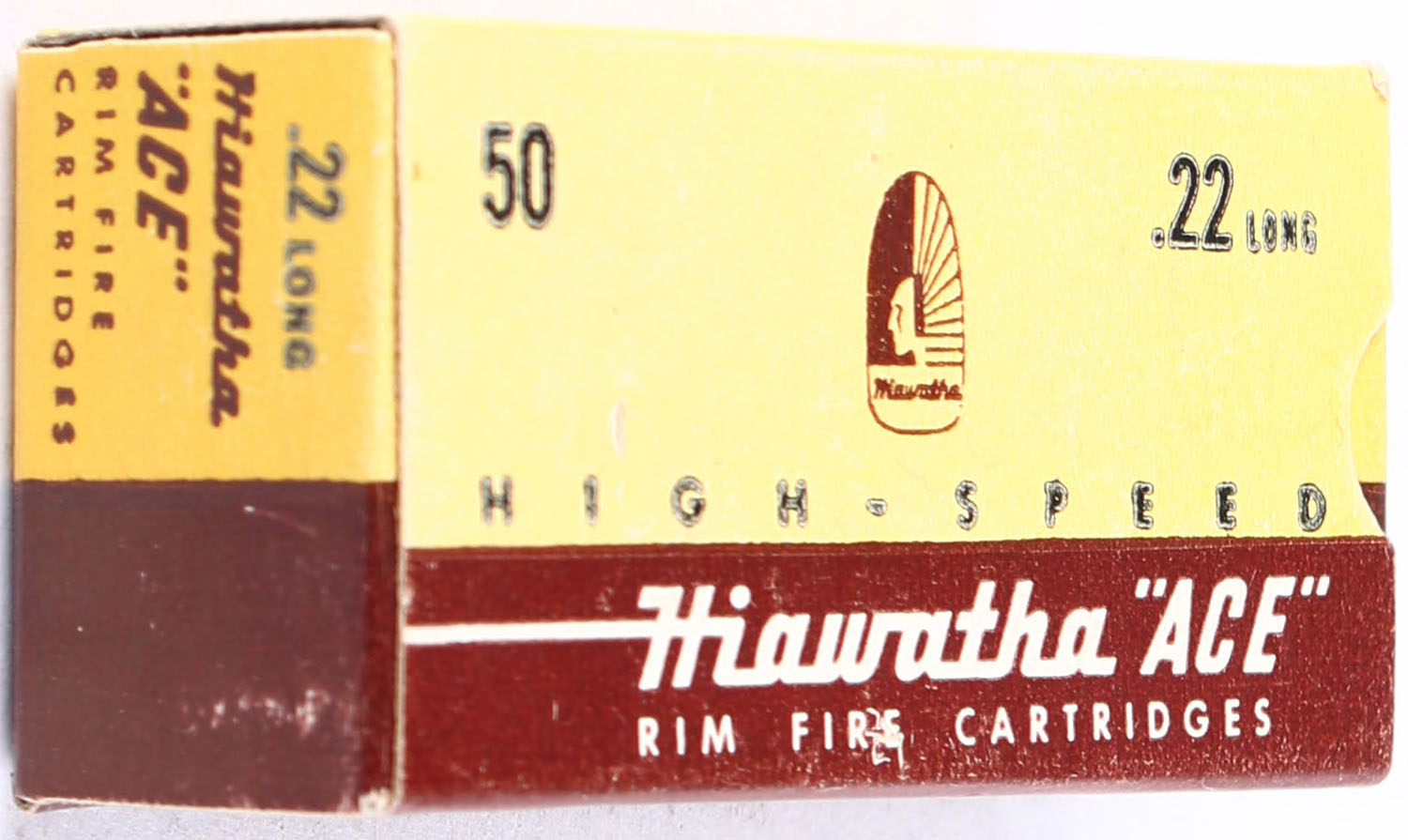 Gambles, Hiawatha ''ACE'', .22 Long, RHWeb: GS-2 L-1, Full, 1pc., yellow brown & white box, box is solid with near mint colors & condition, end flaps are solid, ammo is excellent. Grade: Excellent ++ - Value: 10 to 40