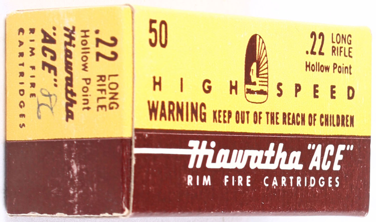 Gambles, Hiawatha ''ACE'', .22 Long Rifle Hollow Point, with warning, RHWeb: GS-4 LR-2, Full, 1pc., yellow brown & white box, box is solid with near mint colors & condition, end flaps are solid, ammo is excellent. Grade: Excellent ++ - Value: 10 to 40