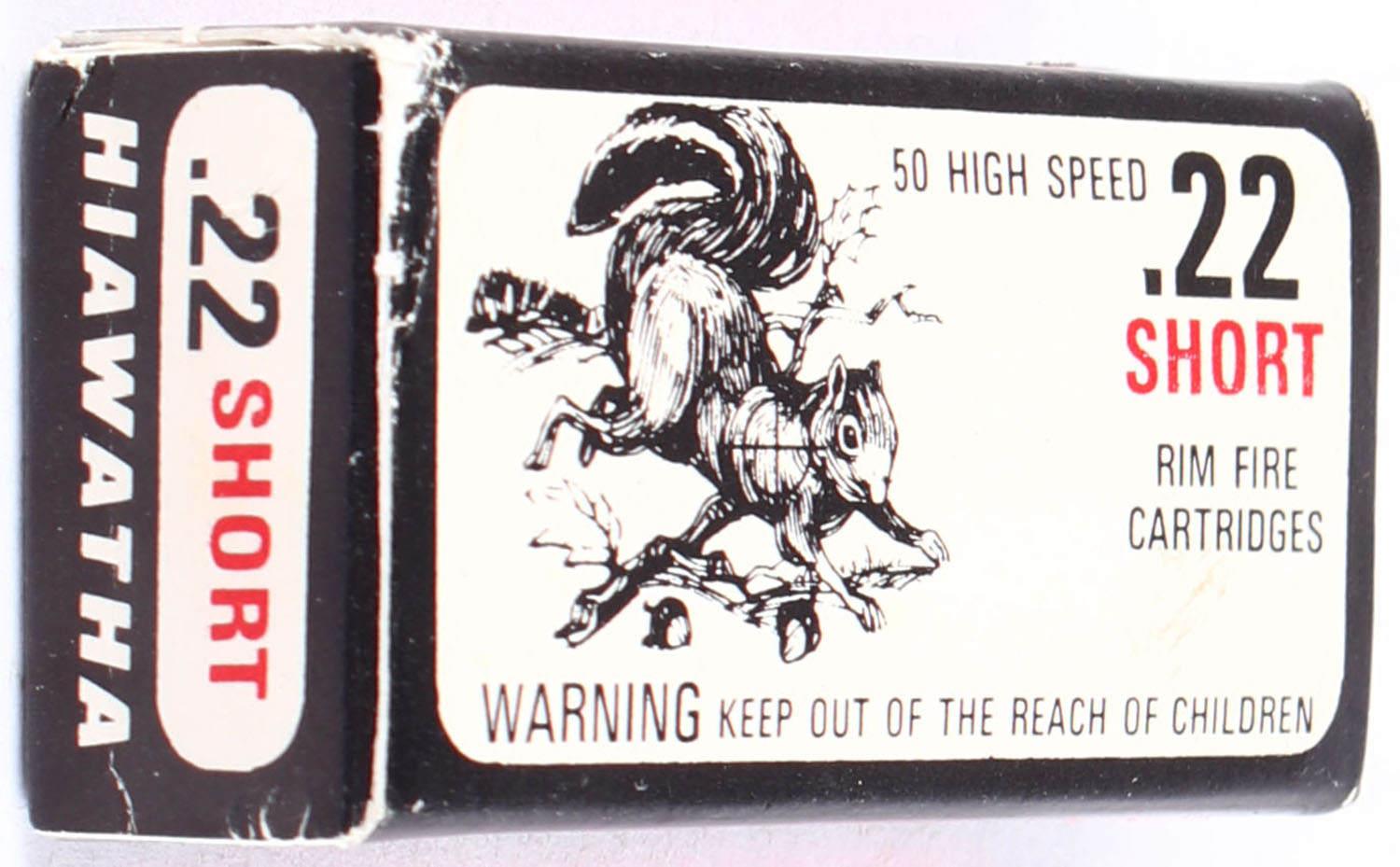 Gambles, Hiawatha, .22 Short, RHWeb: GS-5 S-1a, Full, 1pc., white black & red box, box is solid with excellent color, edges are crisp, end flaps are solid, ammo is excellent to minty. Grade: Excellent ++ - Value: 40 to 120