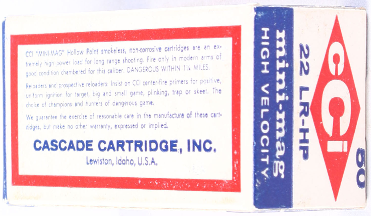 CCi, mini-mag, .22 Long Rifle HP, RHWeb: CCI-1 S-6 with o-4 HS & copper bullets, Full, 1pc. White blue & red box, box is solid with minty color, very minor corner wear, edges are crisp, end flaps are rigid, ammo is minty. Grade: Excellent ++ - Value: 10 to 20