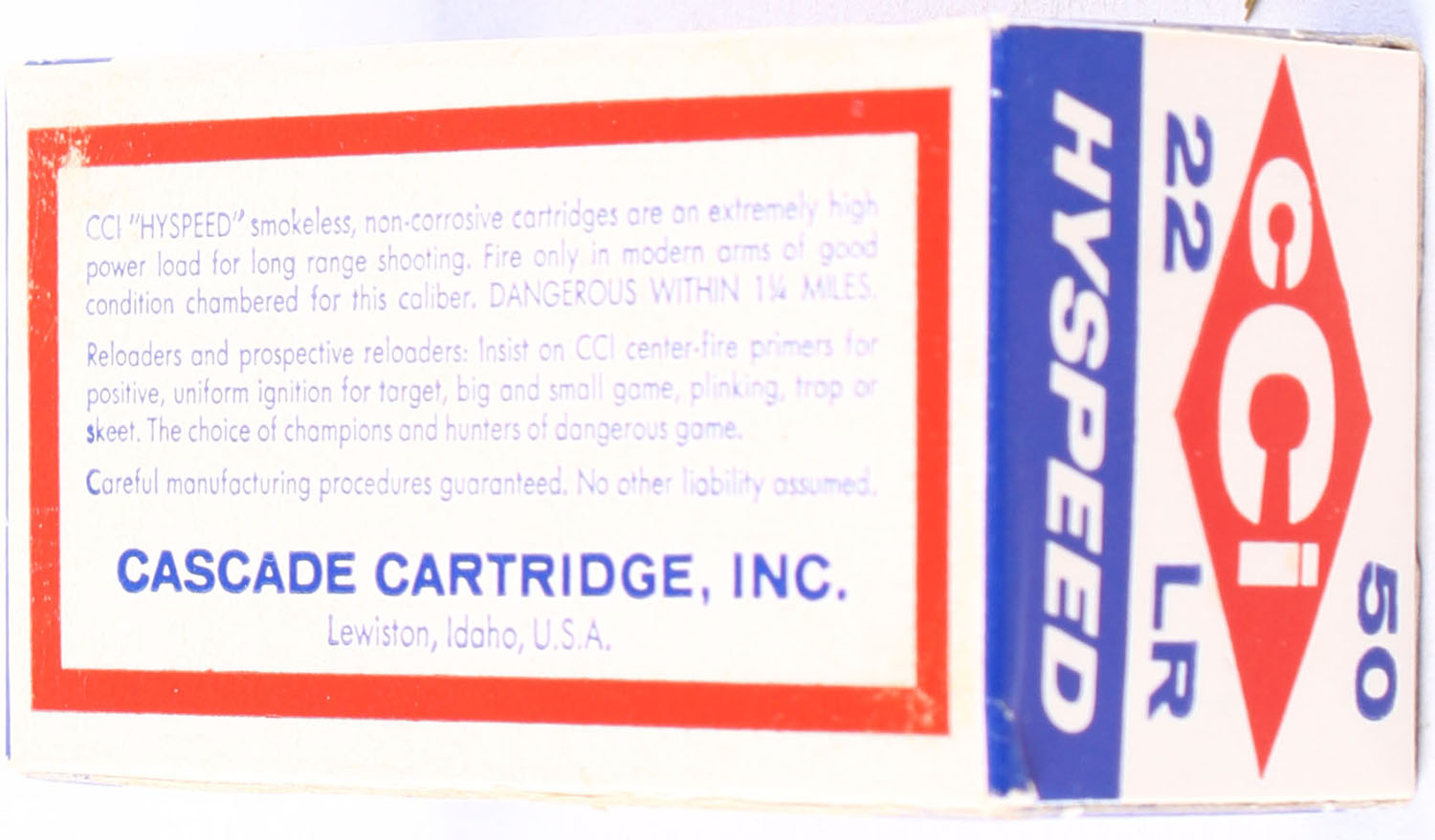 CCi, Hyspeed, .22 Long Rifle, RHWeb: CCI-1 LR-1, Full, 1pc., white blue & red box, box is solid with minty color, corners are sharp, edges are crisp, end flaps are rigid, ammo is minty. Grade: Excellent ++ - Value: 10 to 20