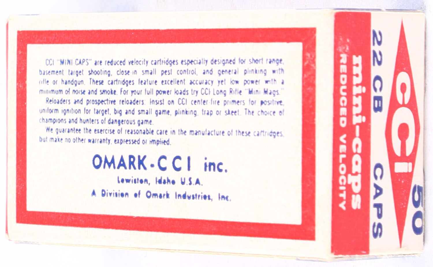 CCi, mini-caps, .22 CB Caps, reduced velocity, RHWeb: CCI-2 CB-1b, Full, 1pc., white blue & red box, box is solid with minty color, edges are crisp, end flaps are rigid, ammo is minty. Grade: Excellent ++ - Value: 10 to 20