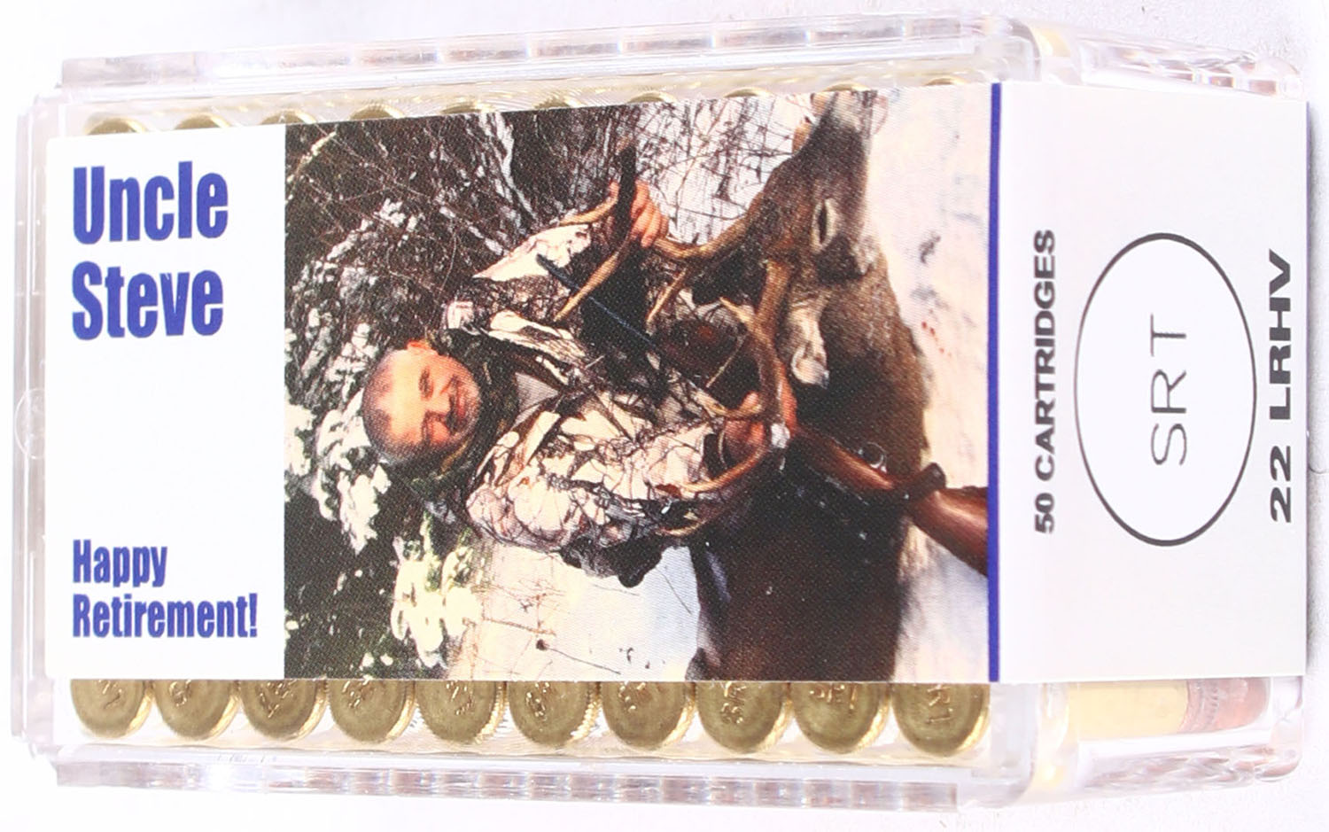 CCi, Uncle Steve Retirement Commemorative box, .22 Long Rifle High Velocity, 2pc. Clear plastic tray with printed ''fabric'' style label, box is mint, tray is clear, label has minty color. Grade: MINT - Value: 50 to 150