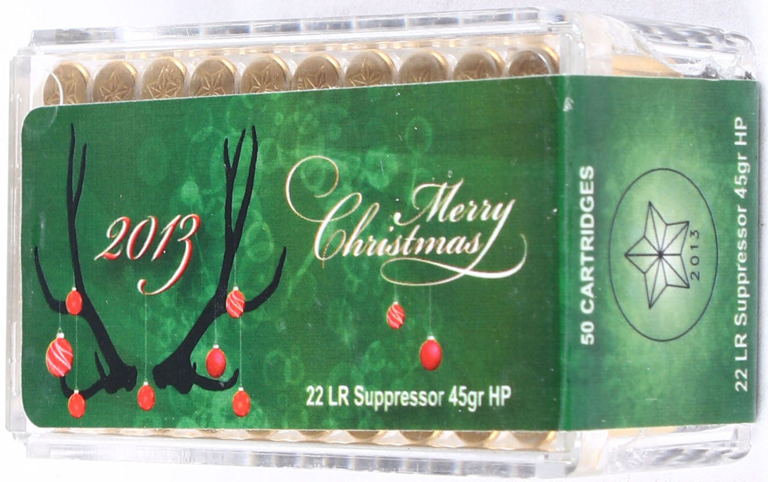 CCi, Merry Christmas 2013, .22 LR Suppressor 45gr HP, FULL & SEALED, 2pc. Clear plastic tray with label featuring elk antlers with red Christmas ornaments hanging, plastic tray is clean & clear, label is intact with minty color. Grade: MINT - Value: 30 to 100