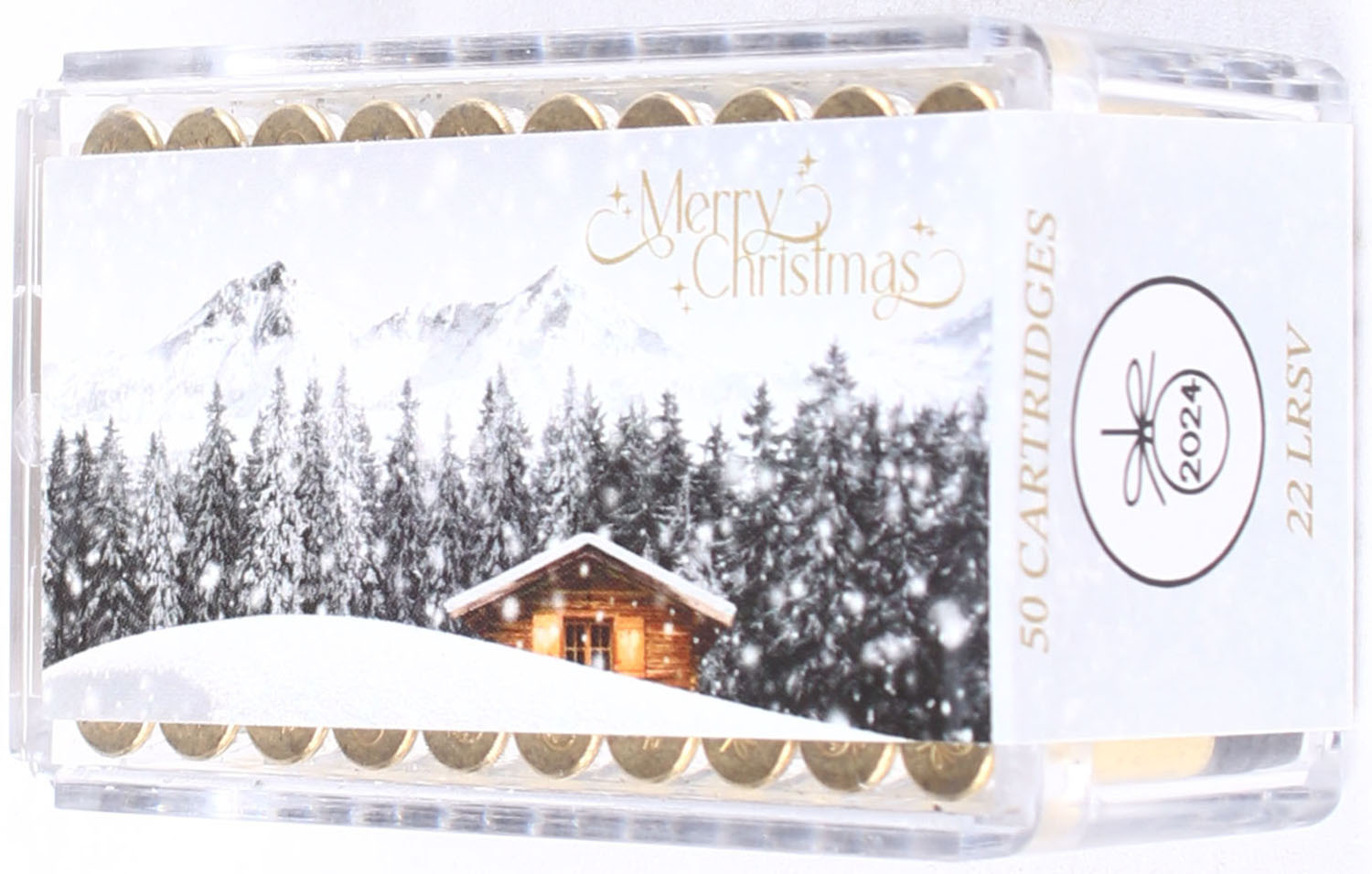 CCi, Merry Christmas 2024, .22 Long Rifle, Standard Velocity, not in RHWeb, FULL & SEALED, 2pc. Clear plastic tray with label featuring a snowy mountain cabin, box is MINT with minty color, label is intact, ammo appears minty. Grade: MINT - Value: 50 to 300
