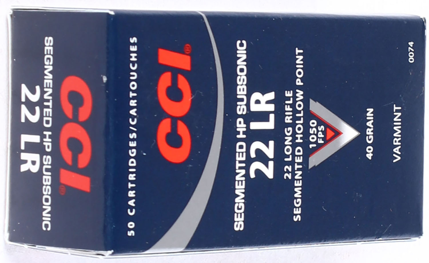CCi, Segmented HP Subsonic, .22 LR HP, FULL, 1pc. box is MINT with minty color, ammo appears minty. Grade: MINT - Value: 10 to 50