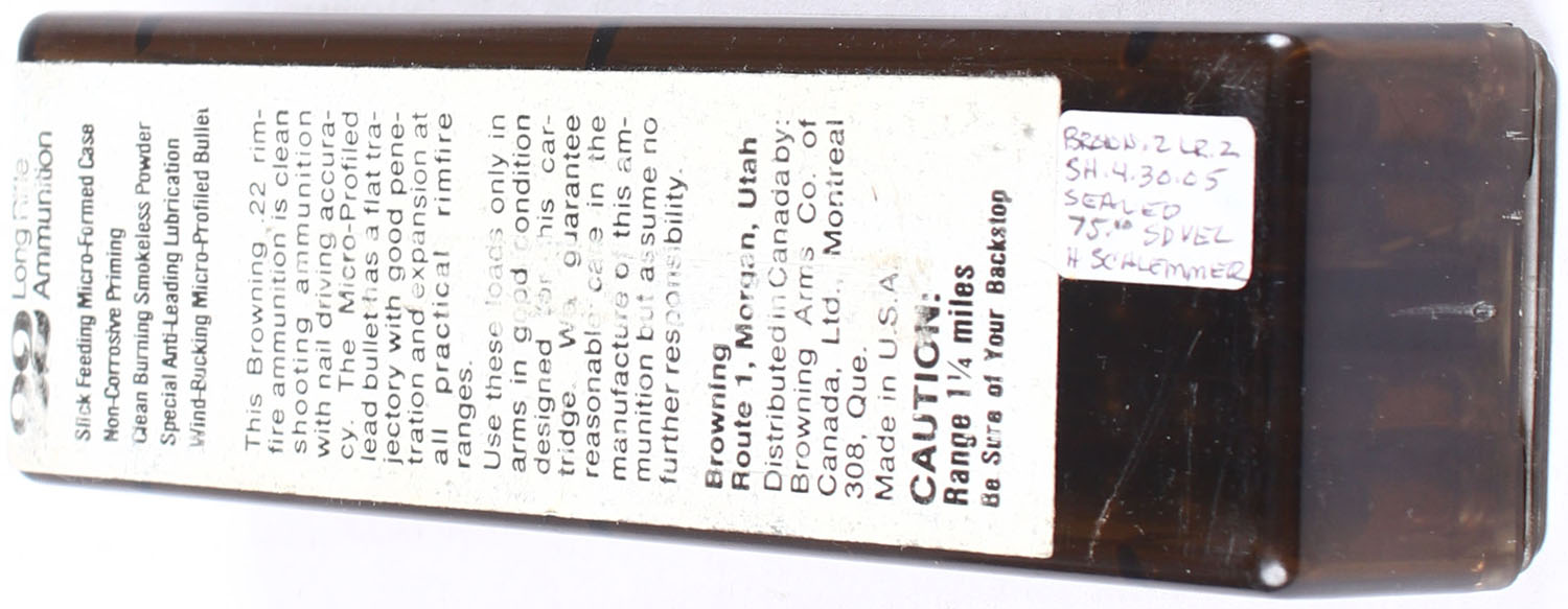 Browning, Nail Drivers, .22 Long Rifle, 40 Grain Solid Nose, RHWeb: BROWN-2 LR-3, FULL & SEALED, 1pc. Smoke plastic tray with yellow & black sealing label, box is near mint with excellent to minty color, only very minor shelf wear, label is intact, ammo appears minty. Grade: Excellent ++ - Value: 20 to 30
