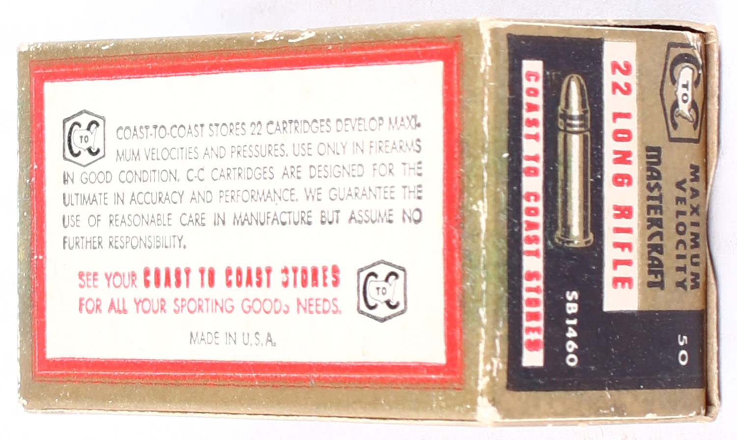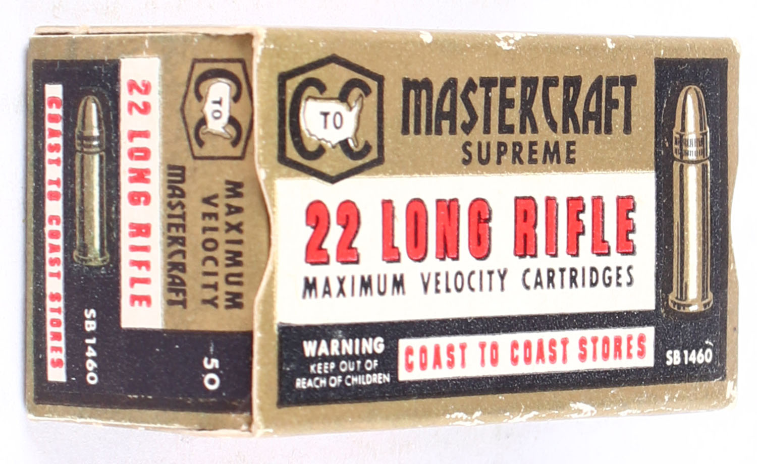 Coast to Coast, Mastercraft Supreme, .22 Long Rifle, RHWeb: CTC-1 LR-1, Full, 1pc. Gold white & red box, box is solid with excellent color, very minor edge & corner wear, end flaps are solid, ammo is excellent. Grade: Excellent - Value: 16 to 24
