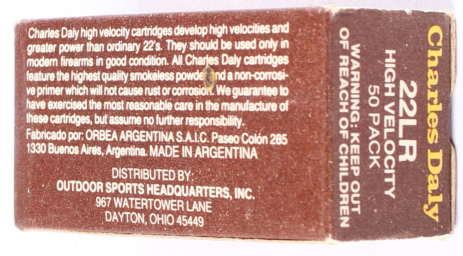Outdoor Sports Headquarters, Charles Daly, .22 Long Rifle, High Velocity, RHWeb: OSH-1 LR-1, Full, 1pc. Brown white & orange box, box is solid with excellent color, very minor age soiling & corner wear, edges are mostly crisp, end flaps are solid, ammo is excellent. Grade: Excellent + - Value: 8 to 12
