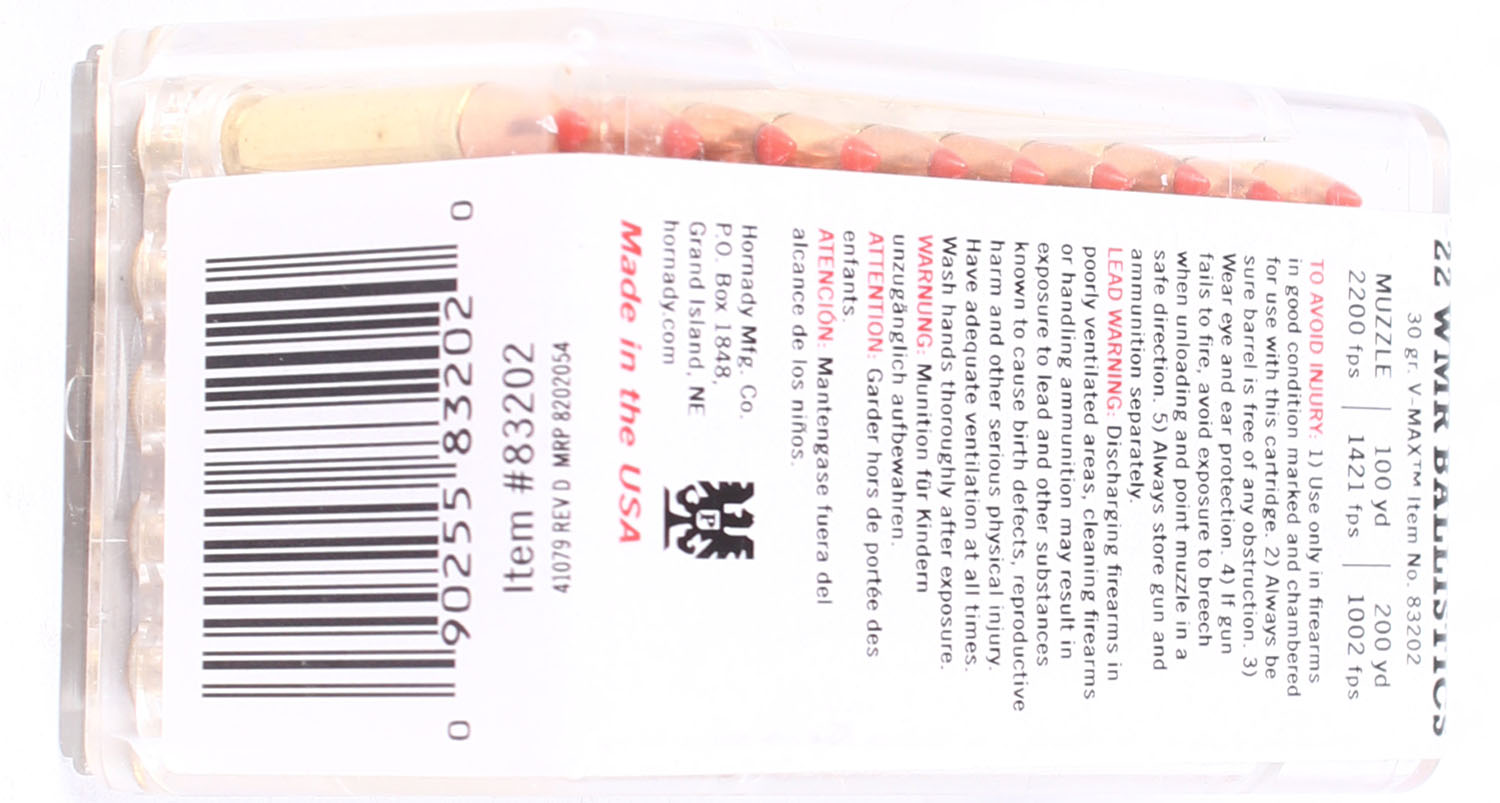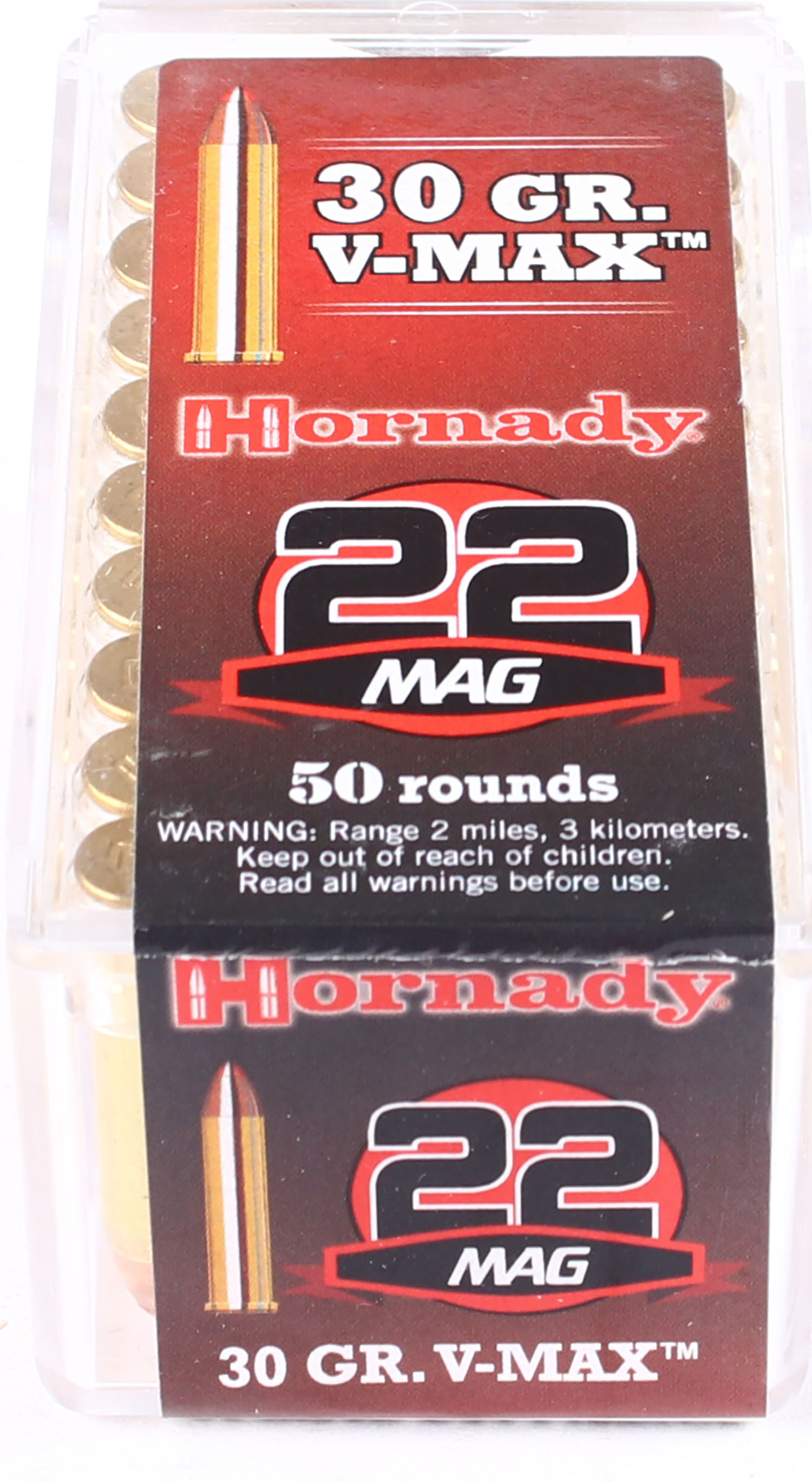 Hornady, .22 Magnum, 30 Grain V-Max, 2200 FPS, Full, 2pc. Clear plastic tray with red & black sealing label, box is MINT, label is intact, ammo is minty. Grade: Excellent ++ - Value: 20 to 30