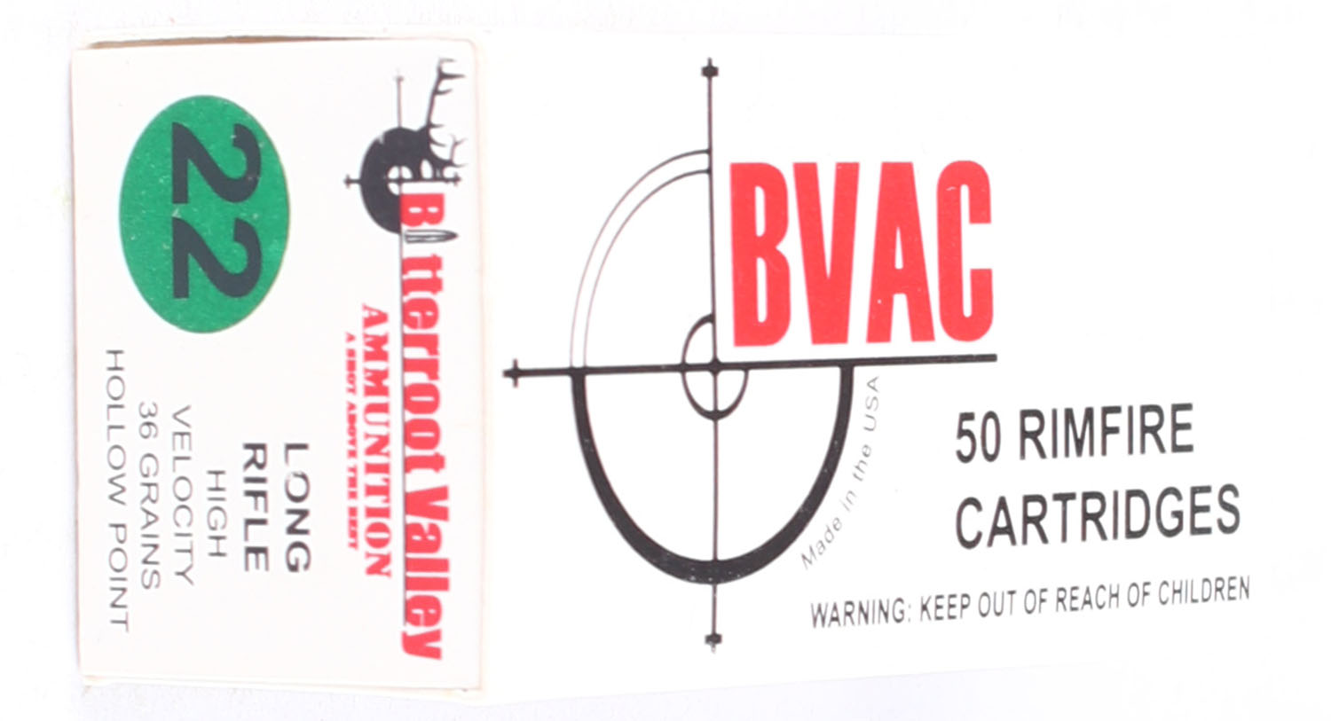 Bitterroot Valley, .22 Long Rifle Hollow Point, High Velocity, RHWeb: BVAC-1 LR-2, Full, 1pc. White & red box, box is MINT with minty color, sharp corners, crisp edges, rigid end flaps, ammo is mint. Grade: MINT - Value: 80 to 120