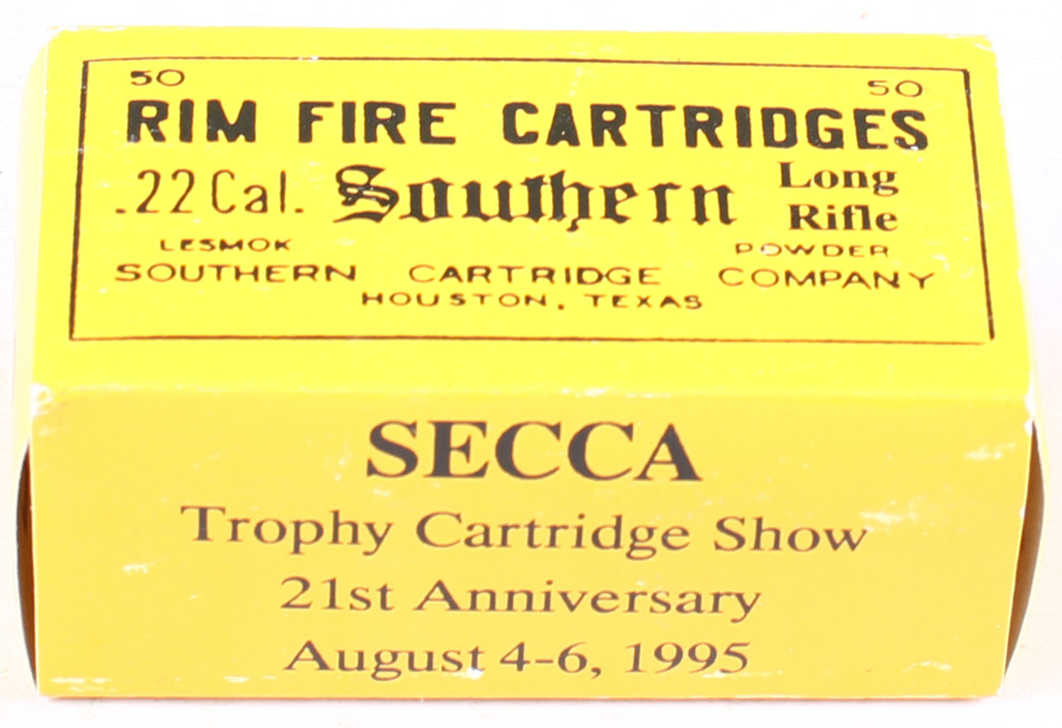 SECCA, Southern Cartridge Company, .22 Long Rifle, RHWeb: SECCA-2 1995, Full, 1pc. Yellow & black box, box is MINT with minty color, corners are sharp, edges are crisp, end flaps are solid, ammo is mint. Grade: MINT - Value: 40 to 60
