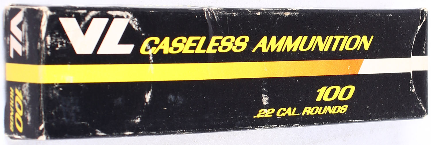Daisy & Heddon, VL Caseless Ammunition, .22 Caliber, not in RHWeb, Full, 1pc. Black yellow & white box, box is solid with excellent color, very minor shelf & corner wear, edges are mostly crisp, end flaps are solid, ammo is excellent. Grade: Excellent + - Value: 4 to 10