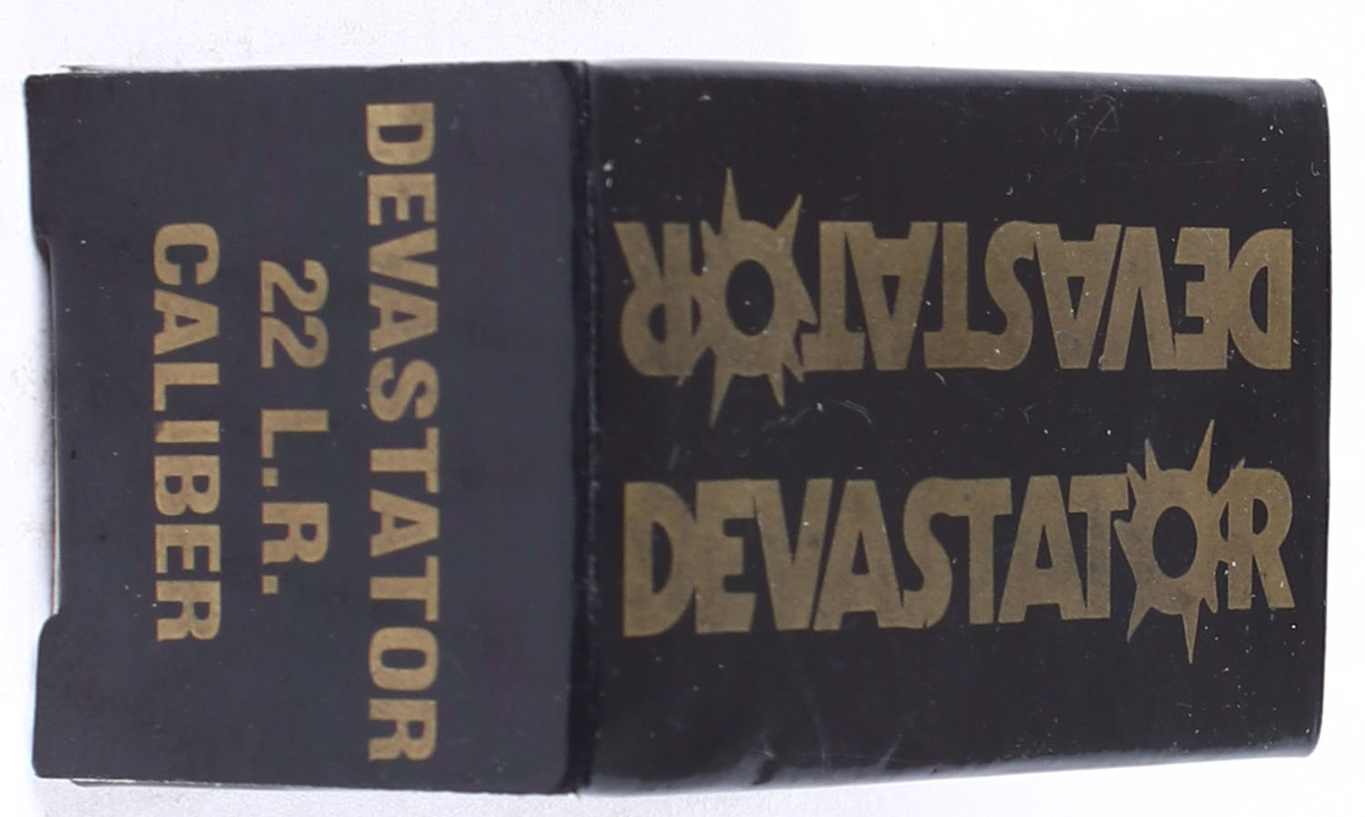 Bingham, Devastator, .22 Long Rifle, RHWeb: BING-1 LR-1, Full, 1pc. Black box with gold printing, box is MINT with minty color, corners are sharp, edges are crisp, end flaps are solid, ammo is fair to good. Grade: MINT - Value: 24 to 36