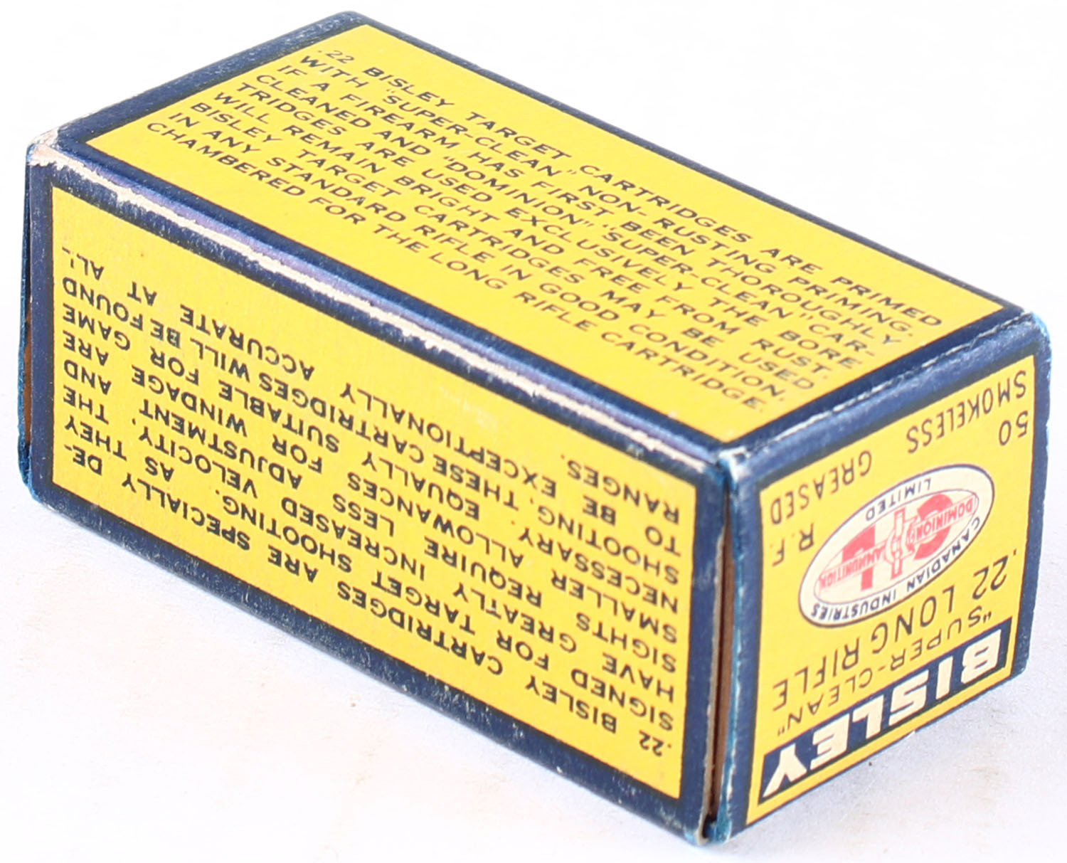C.I.L., Bisley Target, .22 Long Rifle, RHWeb: CIL-2 LR-15b, Full, 1pc. Multicolored box, box is solid with excellent color, very minor edge & corner wear, end flaps are solid, ammo is very good. Grade: Excellent + - Value: 150 to 225