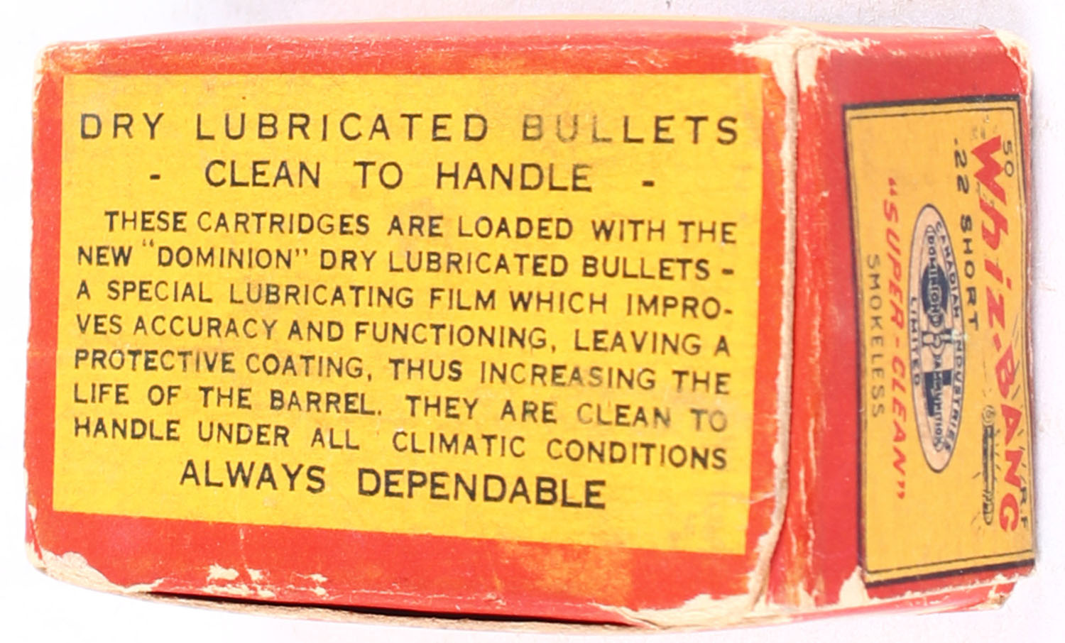 C.I.L., Whiz-Bang, .22 Short, Super-Clean, Dry Lubricated Bullets, RHWeb: CIL-2 S-4b, Full, 1pc. Yellow red & blue box, box is solid with very good to excellent color, minor age soiling, some corner wear, minor edge wear, top flap is solid, ammo is good. Grade: Very Good + - Value: 40 to 60