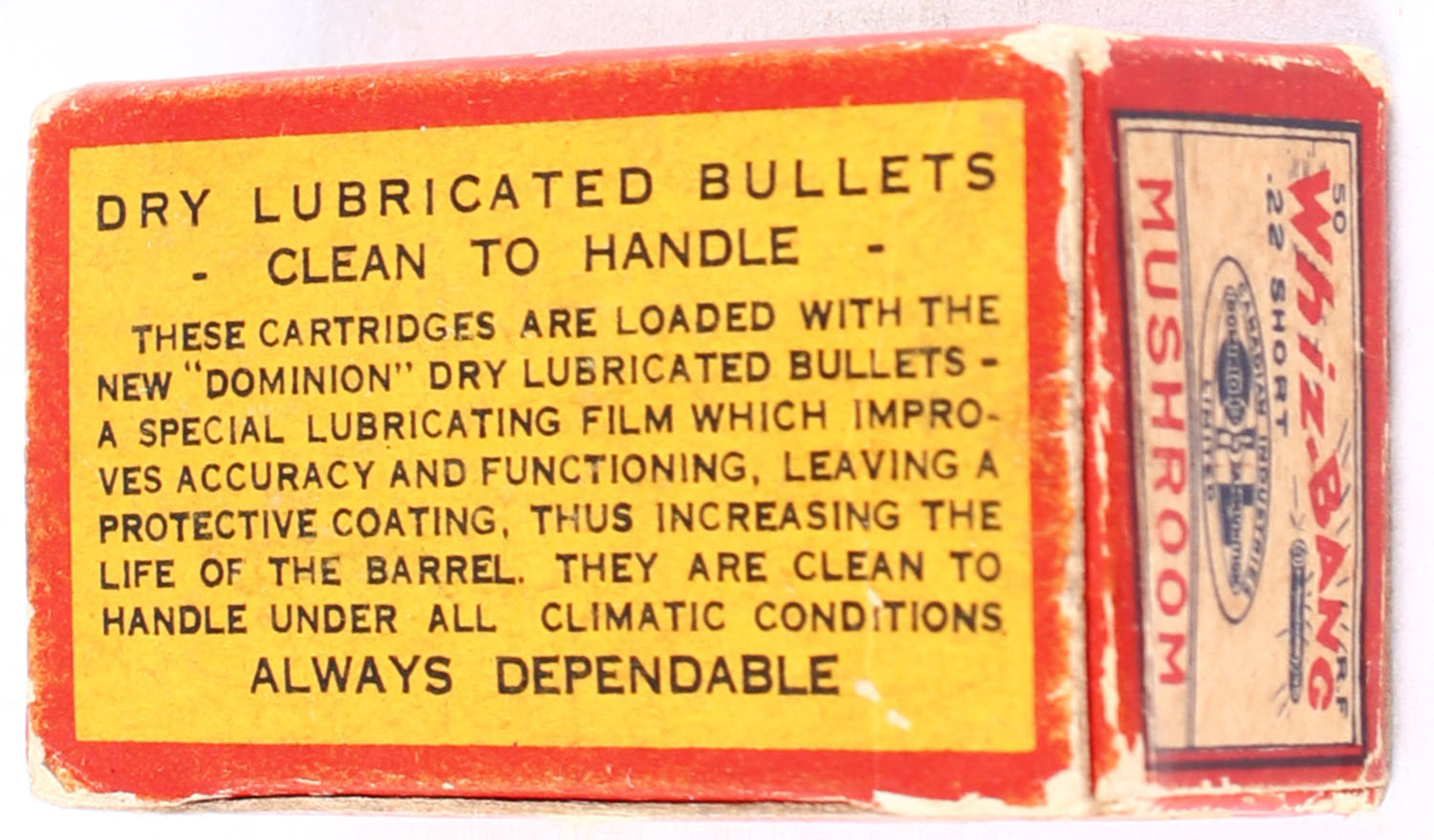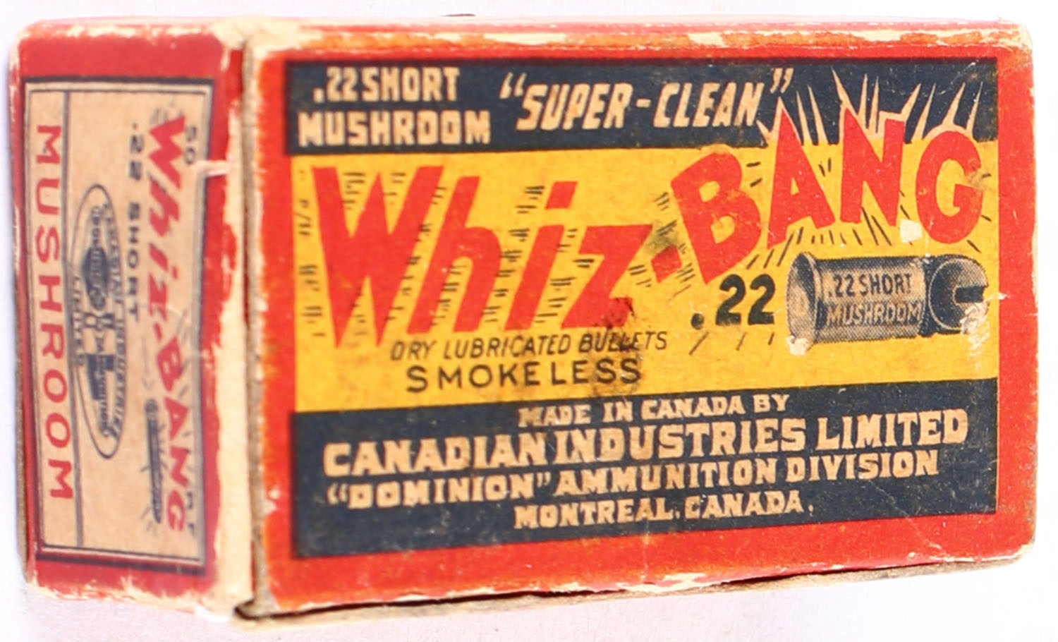 C.I.L., Whiz-Bang, .22 Short Mushroom, Dry Lubricated, Smokeless, 1pc. Yellow red & blue box, box is solid with very good color, some age soiling, partial vertical seam split to front left corner, minor edge & corner wear, top flap is solid, ammo is excellent. Grade: Very Good - Value: 30 to 45