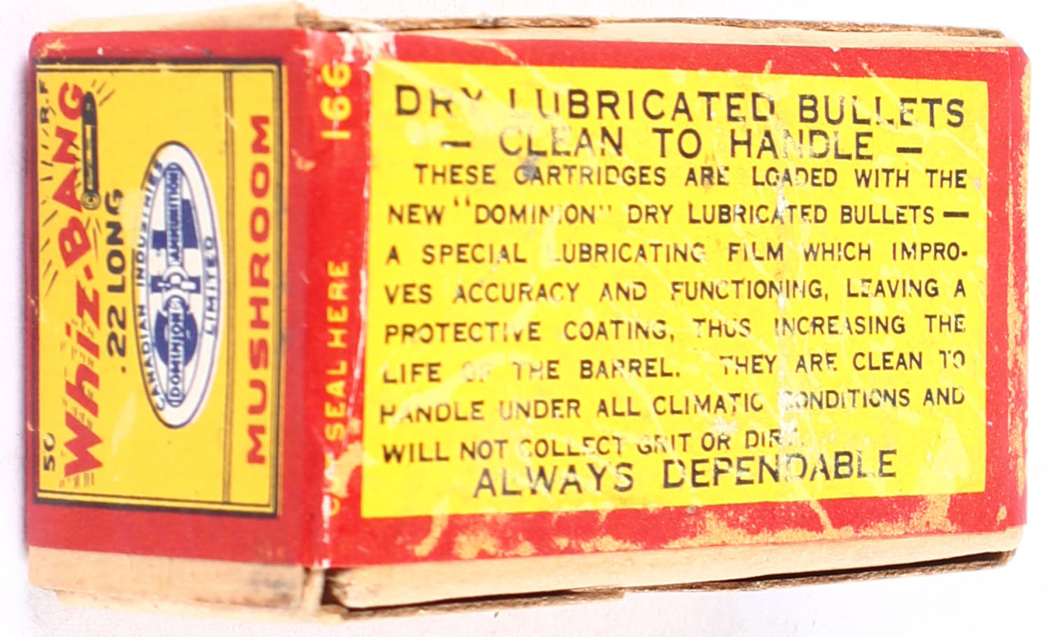 C.I.L., Whiz-Bang, .22 Long Mushroom, Dry Lubricated Bullets, Mushroom, RHWeb: CIL-2 L-4a, FULL & SEALED, 2pc. Buff box with yellow blue & red wraparound label, box is near mint with minty color, only very minor shelf wear, corners are mostly sharp, edges are crisp, label is intact. Grade: Excellent ++ - Value: 150 to 225