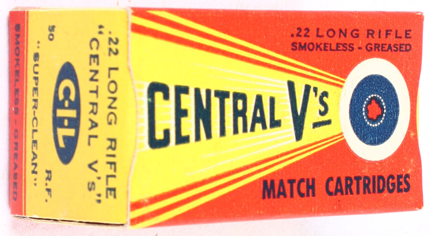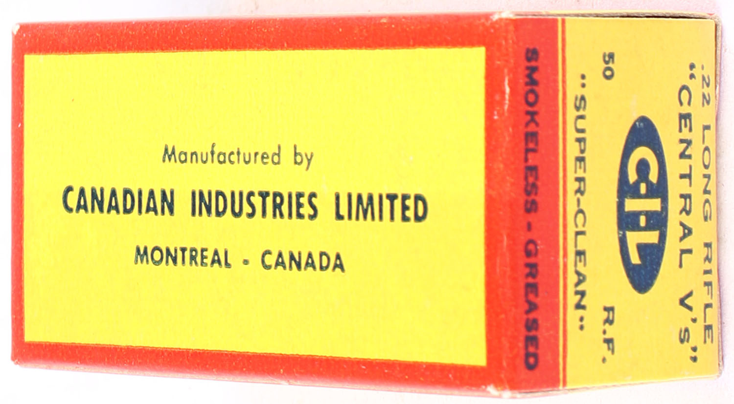 C.I.L., Central V's, .22 Long Rifle, Smokeless - Greased, RHWeb: CIL-2 LR-14, Full, 1pc. Yellow red & blue box, box is solid with excellent color, very minor corner wear, edges are crisp, end flaps are solid, ammo is excellent. Grade: Excellent ++ - Value: 20 to 30