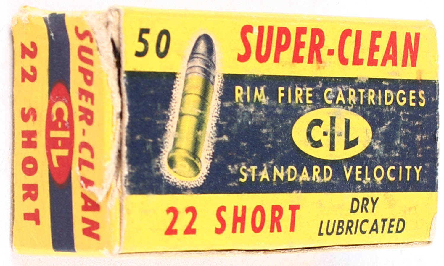 C.I.L., Super-Clean, .22 Short, Standard Velocity, Dry Lubricated, RHWeb: CIL-3 S-3f, Partial 47rds. 1pc. Yellow blue & red box, box is solid with very good color, some shelf wear, tear to top left edge, minor corner wear, edges are mostly crisp, top flap is solid, ammo is excellent. Grade: Very Good - Value: 8 to 12