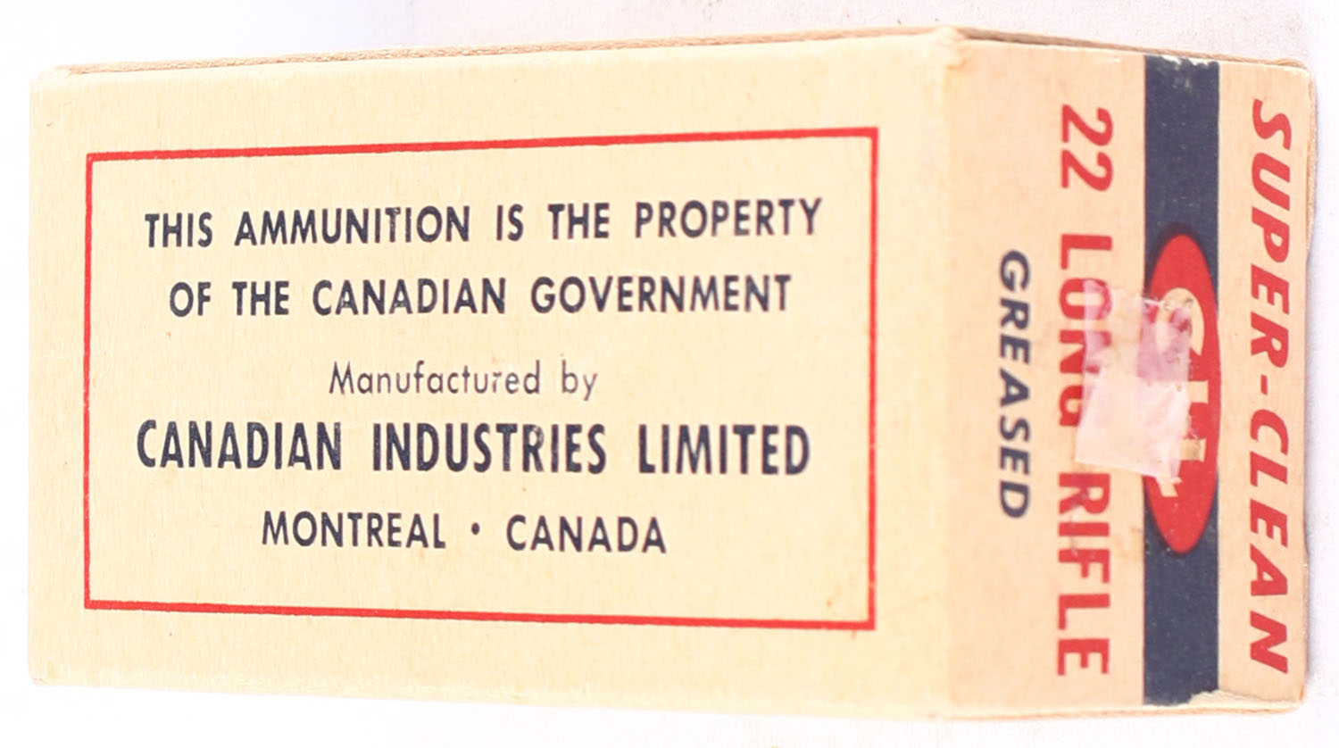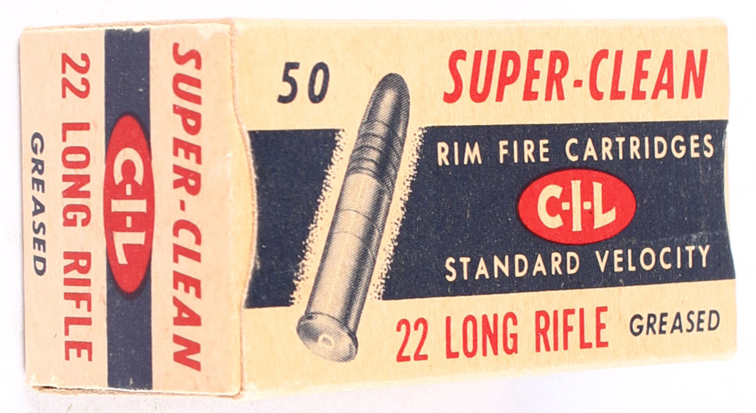C.I.L., Super-Clean, .22 Long Rifle, Standard Velocity, Greased, RHWeb: CIL-4 LR-6, Full, 1pc. Buff blue & red box, box is near mint with minty color, only very minor corner wear, edges are crisp, end flaps are solid, ammo is very good to excellent. Grade: Excellent ++ - Value: 12 to 18