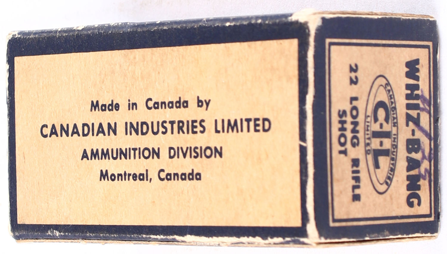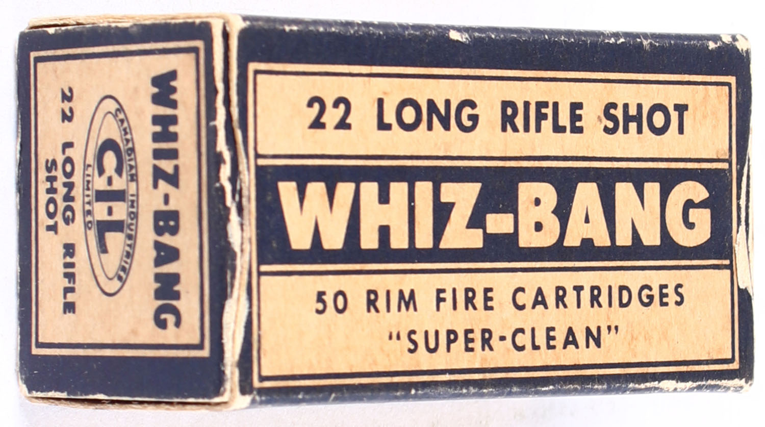 C.I.L., Whiz-Bang, .22 Long Rifle Shot, Super-Clean, RHWeb: CIL-3 LR-5a, Full, 1pc. Buff & blue box, box is solid with excellent color, some edge & corner wear, end flaps are solid, ammo is excellent to minty. Grade: Excellent - Value: 60 to 120