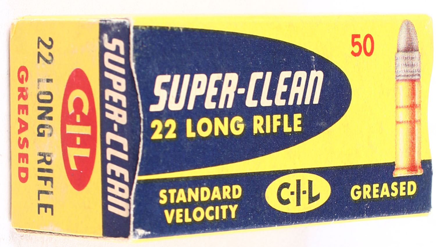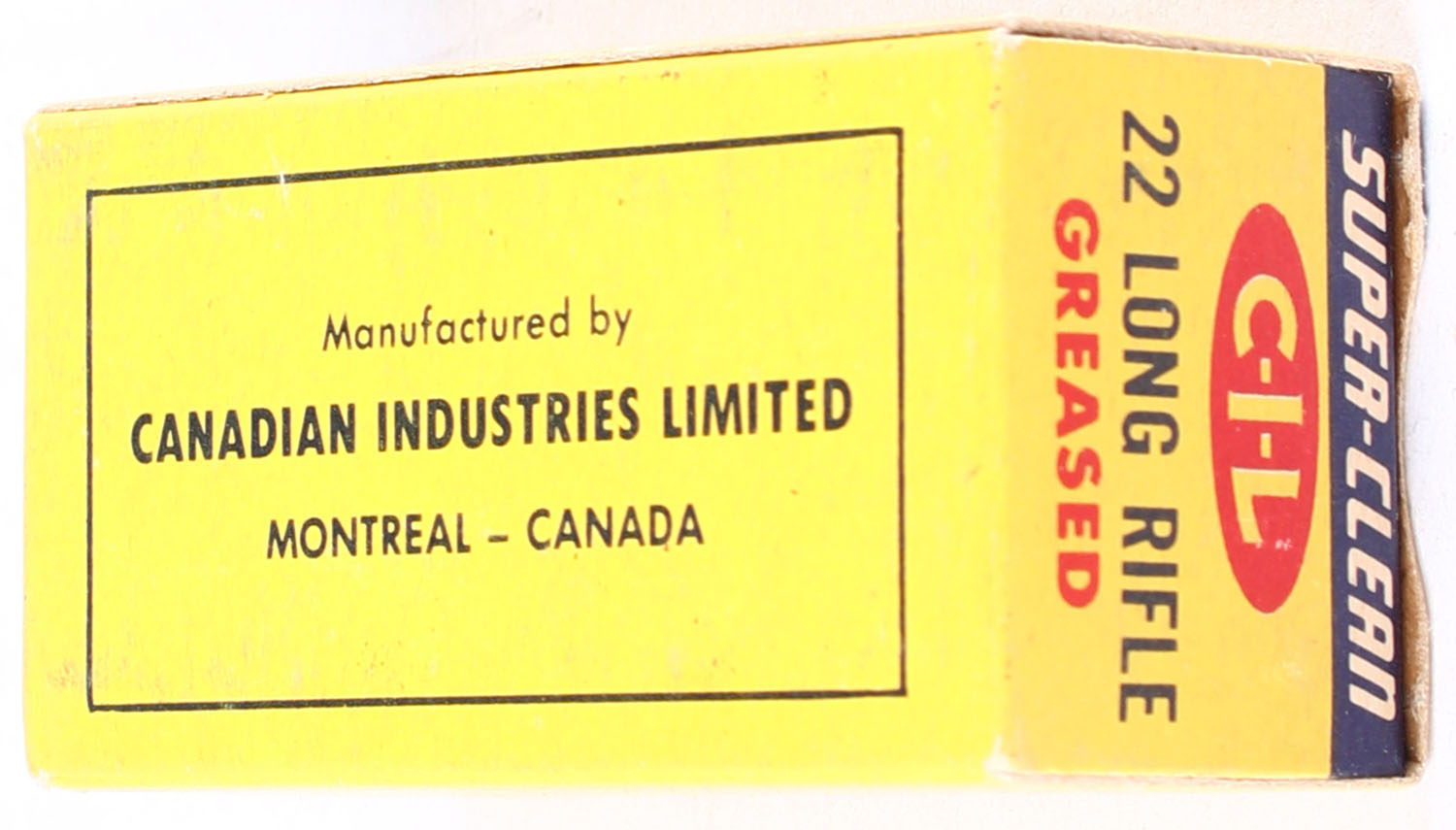 C.I.L., Super-Clean, .22 Long Rifle, Standard Velocity, Greased, RHWeb: CIL-5 LR-3, Full, 1pc. Yellow & blue box, box is solid with excellent color, very minor corner wear, edges are crisp, end flaps are solid, ammo is very good to excellent. Grade: Excellent ++ - Value: 12 to 18