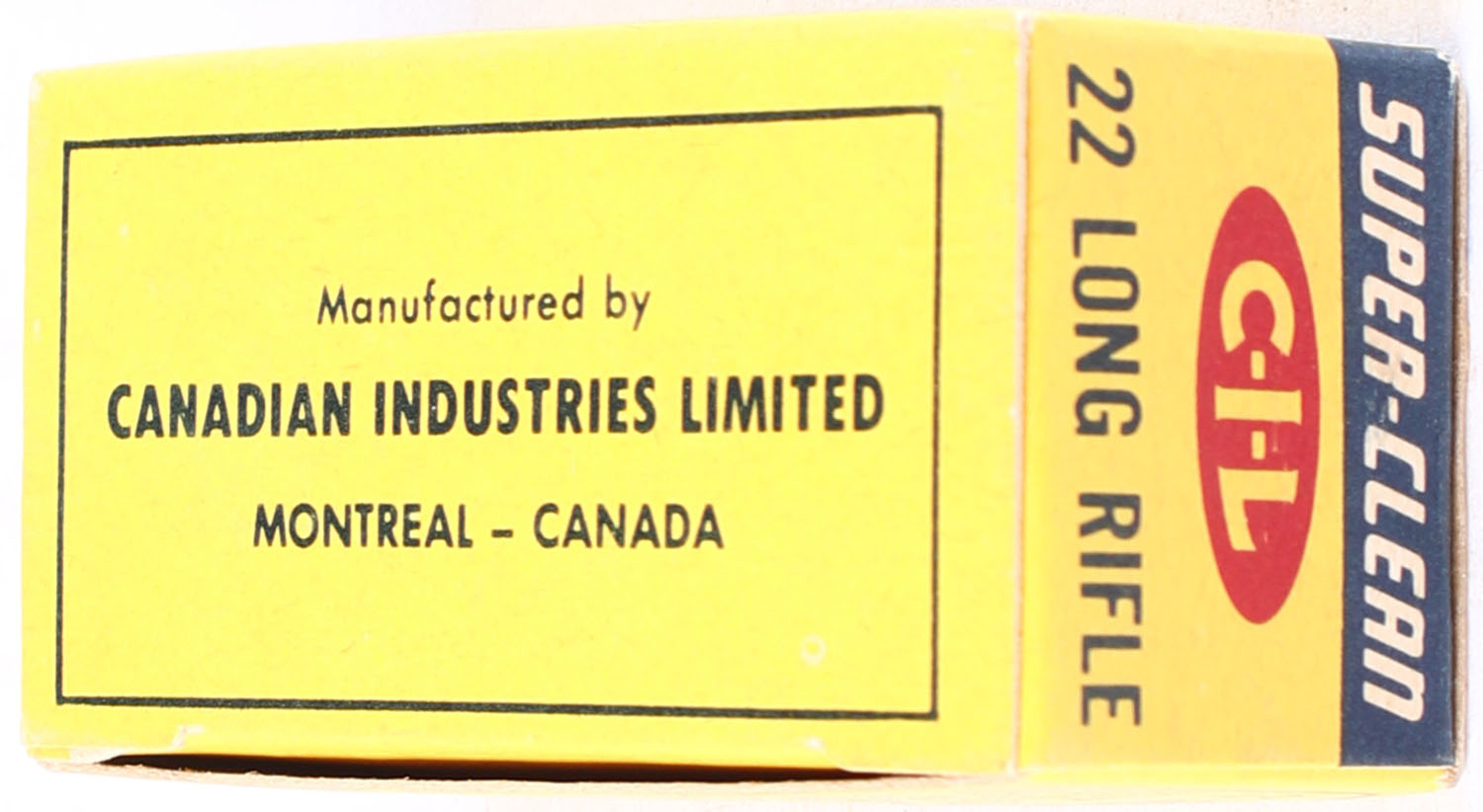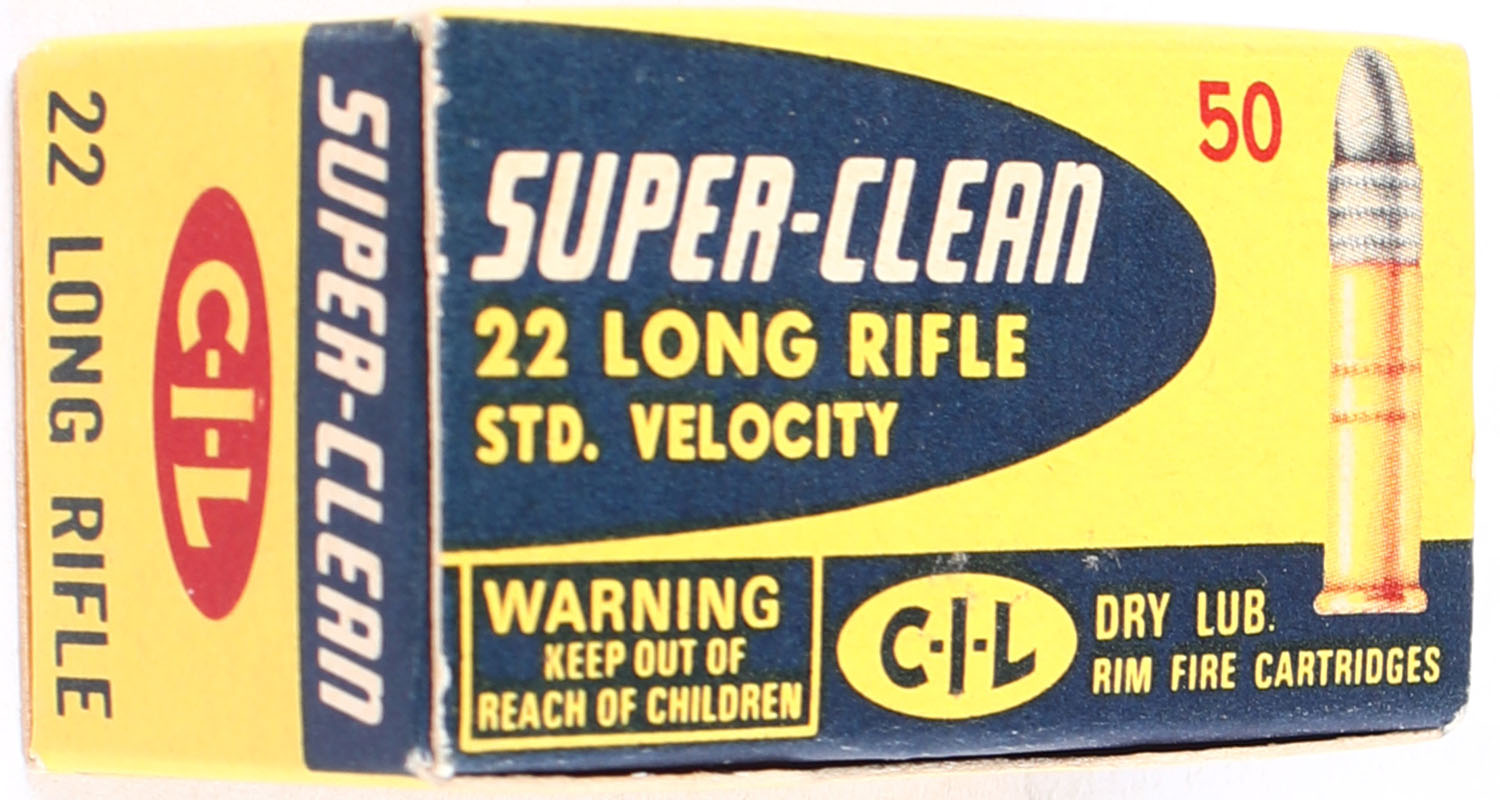 C.I.L., Super-Clean, .22 Long Rifle, Standard Velocity, Dry Lubricated, RHWeb: CIL-6 LR-6, Full, 1pc. Yellow & blue box, box is solid with excellent color, very minor corner wear, edges are crisp, top flap is solid, ammo is excellent to minty. Grade: Excellent ++ - Value: 12 to 18