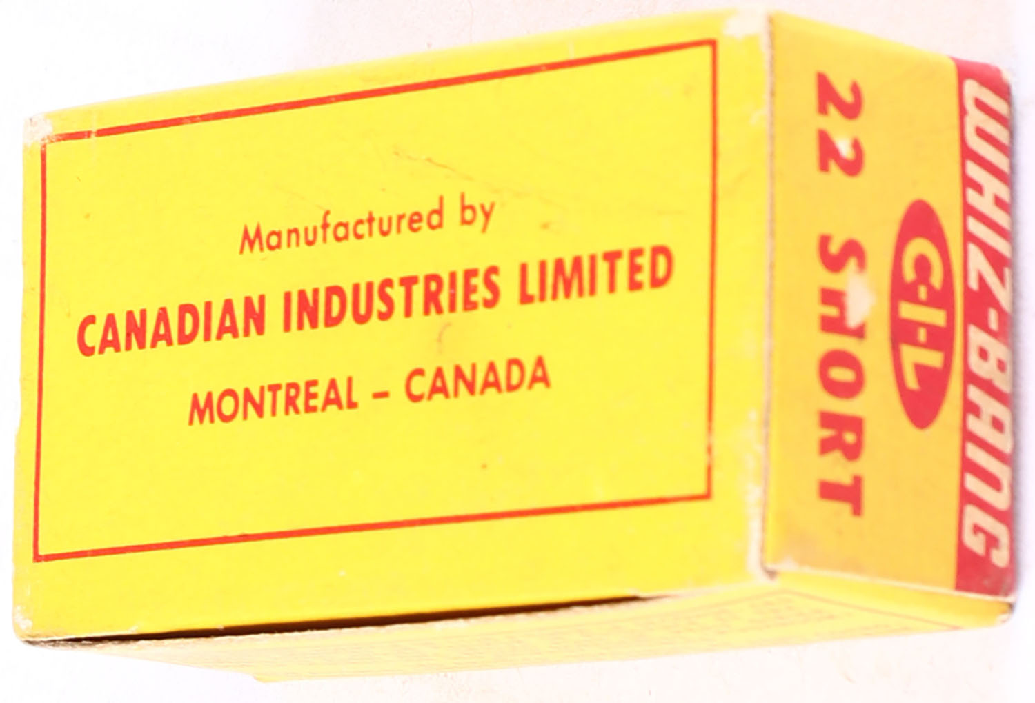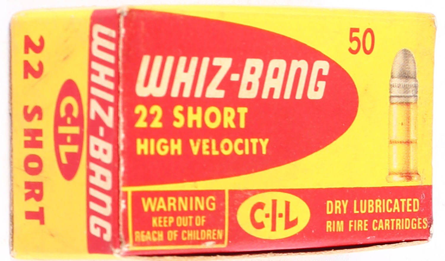 C.I.L., Whiz-Bang, .22 Short, High Velocity, Dry Lubricated, RHWeb: CIL-6 S-1, Full, 1pc. Yellow & red box, box is solid with excellent color, very minor age soiling & corner wear, edges are crisp, top flap is solid, ammo is excellent. Grade: Excellent - Value: 20 to 30