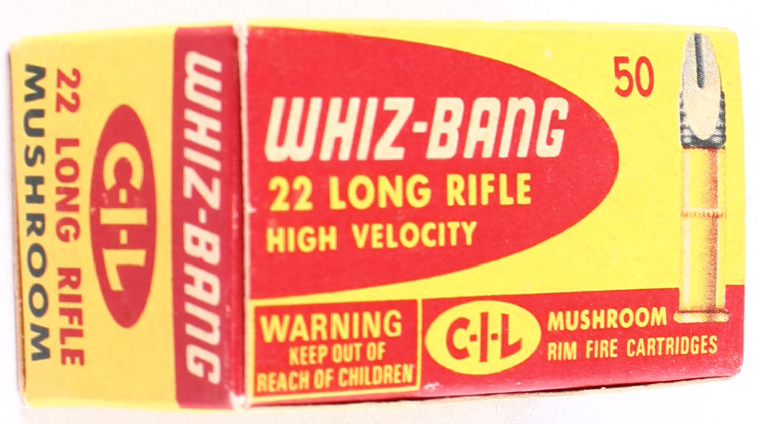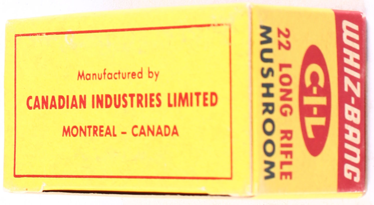 C.I.L., Whiz-Bang, .22 Long Rifle Mushroom,, High Velocity, RHWeb: CIL-6 LR-3, Full, 1pc. Yellow & red box, box is MINT with minty color, corners are mostly sharp, edges are crisp, top flap is solid, ammo is excellent. Grade: Excellent - Value: 20 to 30
