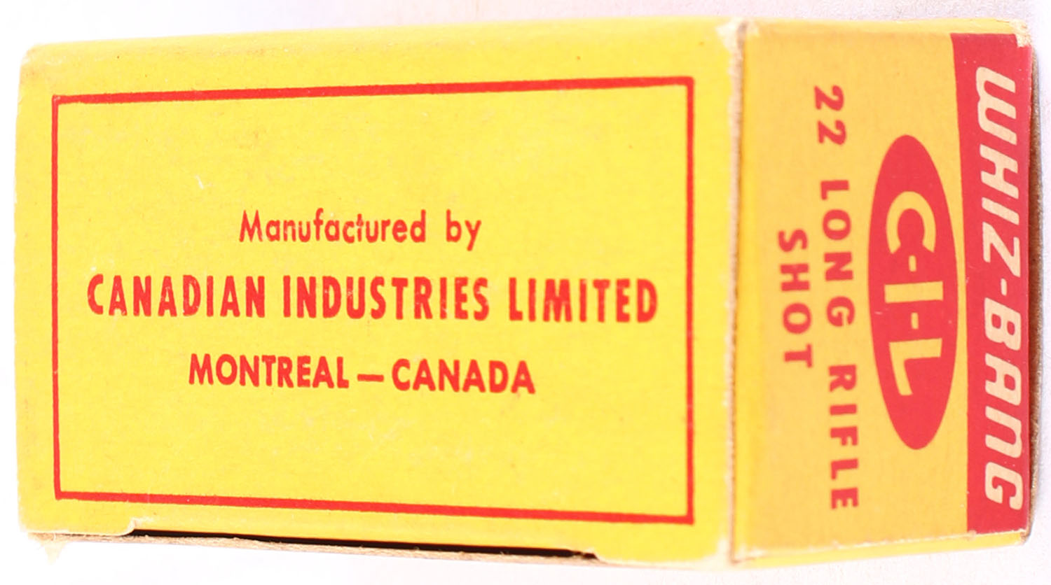C.I.L., Whiz-Bang, .22 Long Rifle Shot, High Velocity, RHWeb: CIL-6 LR-4, Full, 1pc. Yellow & red box, box is solid with excellent color, very minor age soiling & corner wear, edges are crisp, top flap is solid, ammo is excellent to minty. Grade: Excellent ++ - Value: 50 to 75