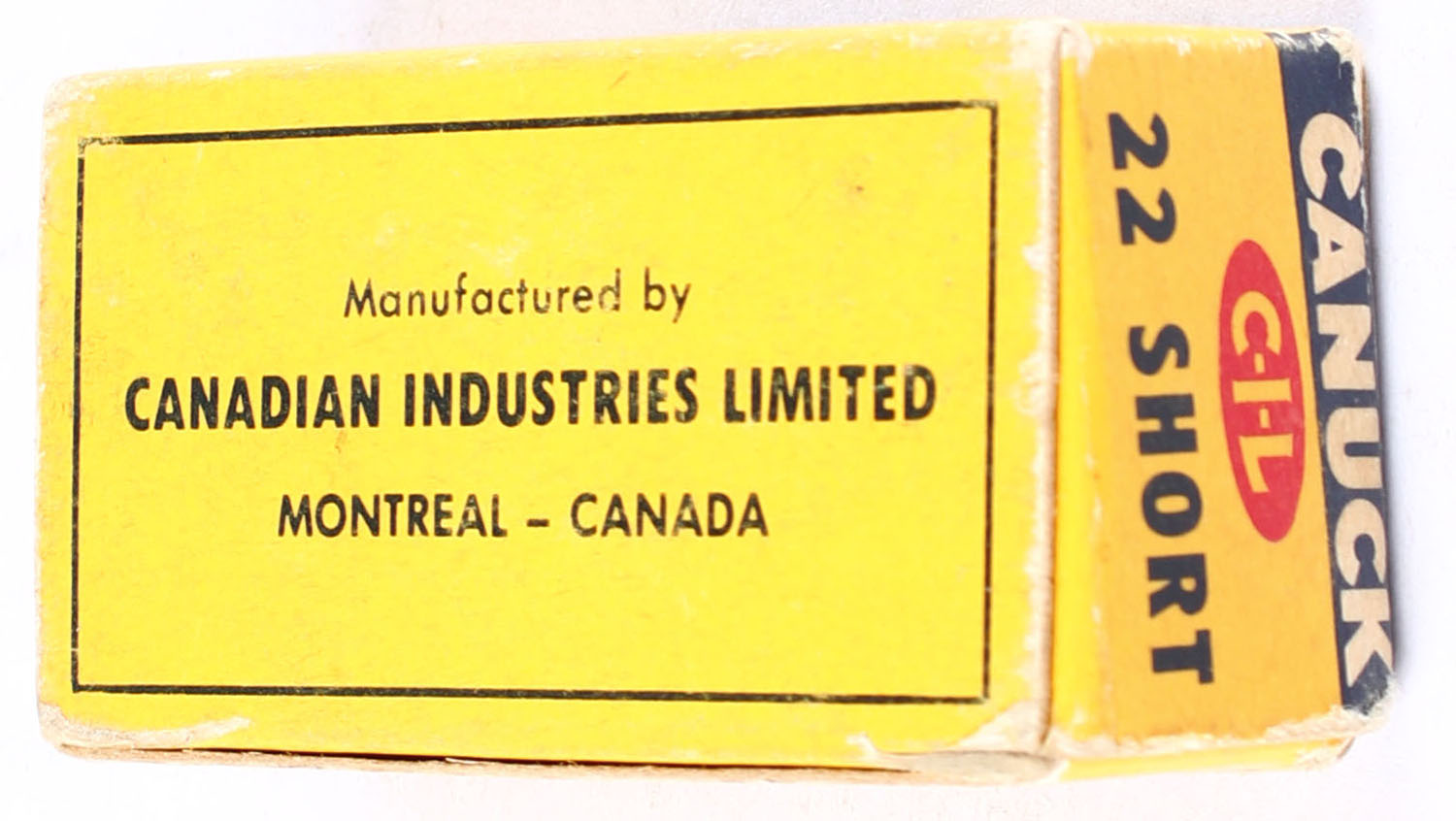 C.I.L., Canuck, .22 Short, Standard Velocity, Dry Lubricated, RHWeb: CIL-6 S-3, Full, 1pc. Yellow & blue box, box is solid with excellent color, some edge & corner wear, top flap is solid, ammo is excellent. Grade: Very Good ++ - Value: 6 to 10