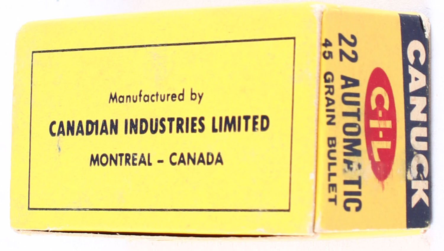C.I.L., Canuck, .22 Winchester Automatic, 45 Grain Bullet, RHWeb: CIL-6 WA-1, Full, 1pc. Yellow & blue box, box is solid with excellent color, minor edge & corner wear, top flap is solid, ammo is minty. Grade: Excellent - Value: 30 to 45