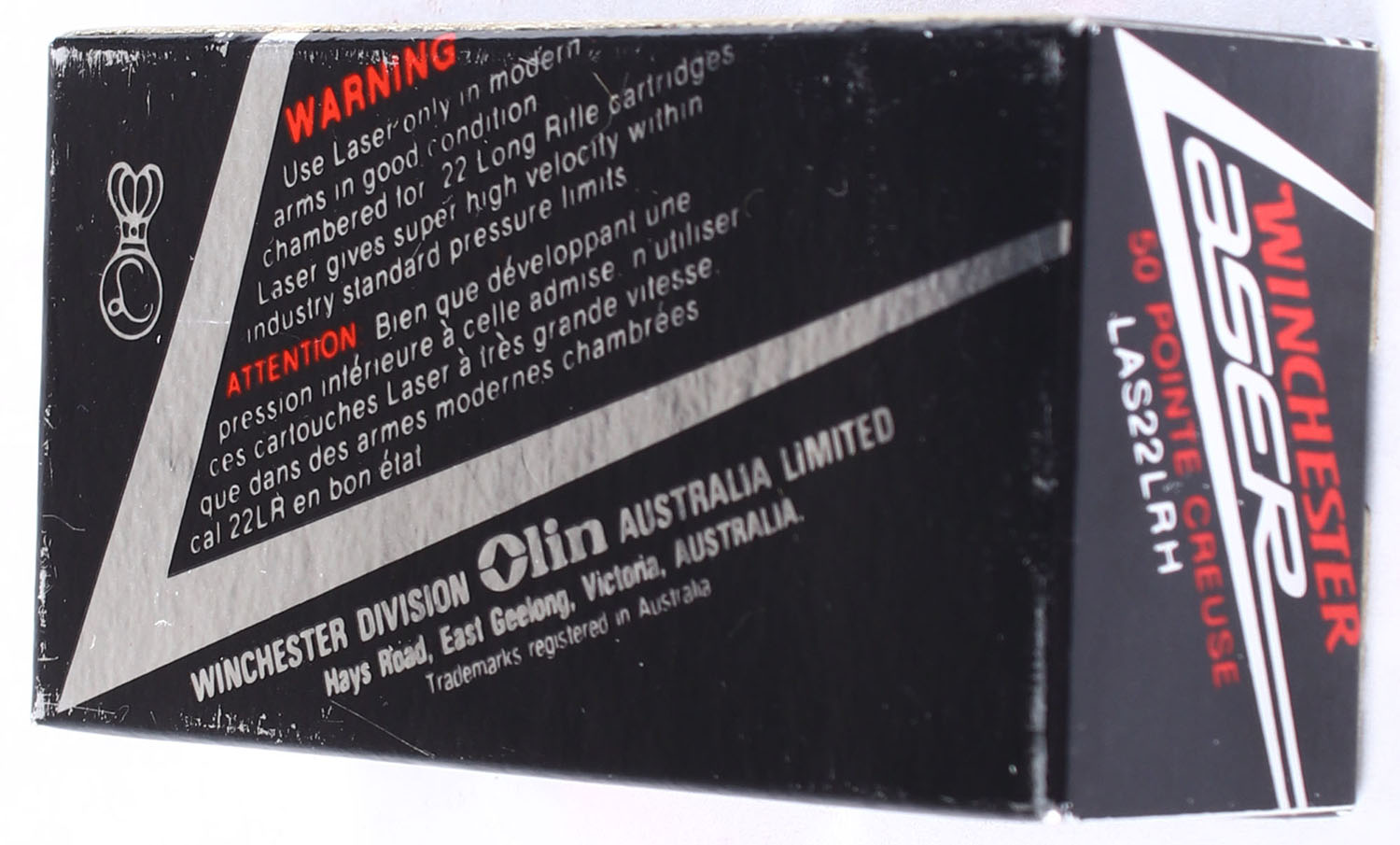 Winchester, Laser, .22 Long Rifle Hollow Point, 37 Grain copper plated HP, RHWeb: (Australia) LASER-1 LR-4b, Full, 1pc. Black silver & red box, box is near mint with minty color, only very minor corner wear, edges are crisp, end flaps are solid, ammo is minty. Grade: Excellent ++ - Value: 60 to 90
