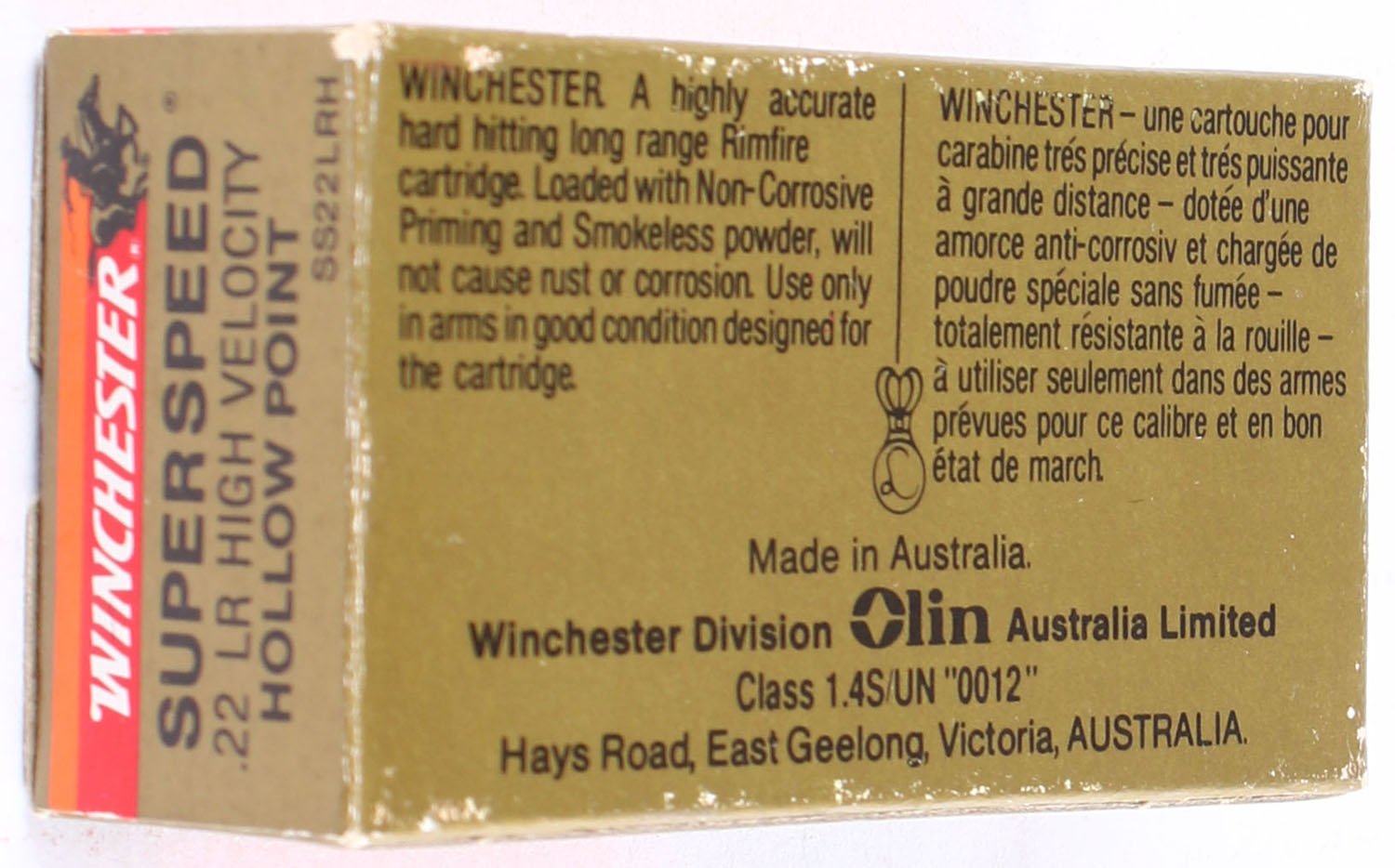 Winchester, Superspeed, .22 Long Rifle Hollow Point, High Velocity, RHWeb: (Australia) SS-3 LR-6Bb, Full, 1pc. Gold red & orange box, box is near mint with minty color, only very minor corner wear, edges are crisp, end flaps are solid, ammo is minty. Grade: Excellent ++ - Value: 30 to 45