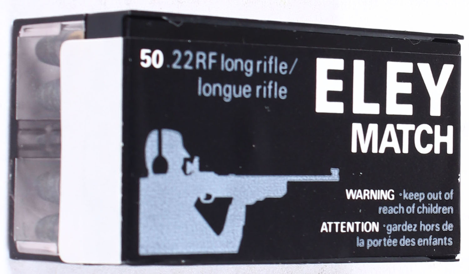 Eley, Match, .22 Long Rifle, Not in RHWeb, FULL & SEALED, 2pc. Clear plastic tray with black sealing label, box is MINT with minty color, label is intact, ammo appears excellent. Grade: MINT - Value: 10 to 50