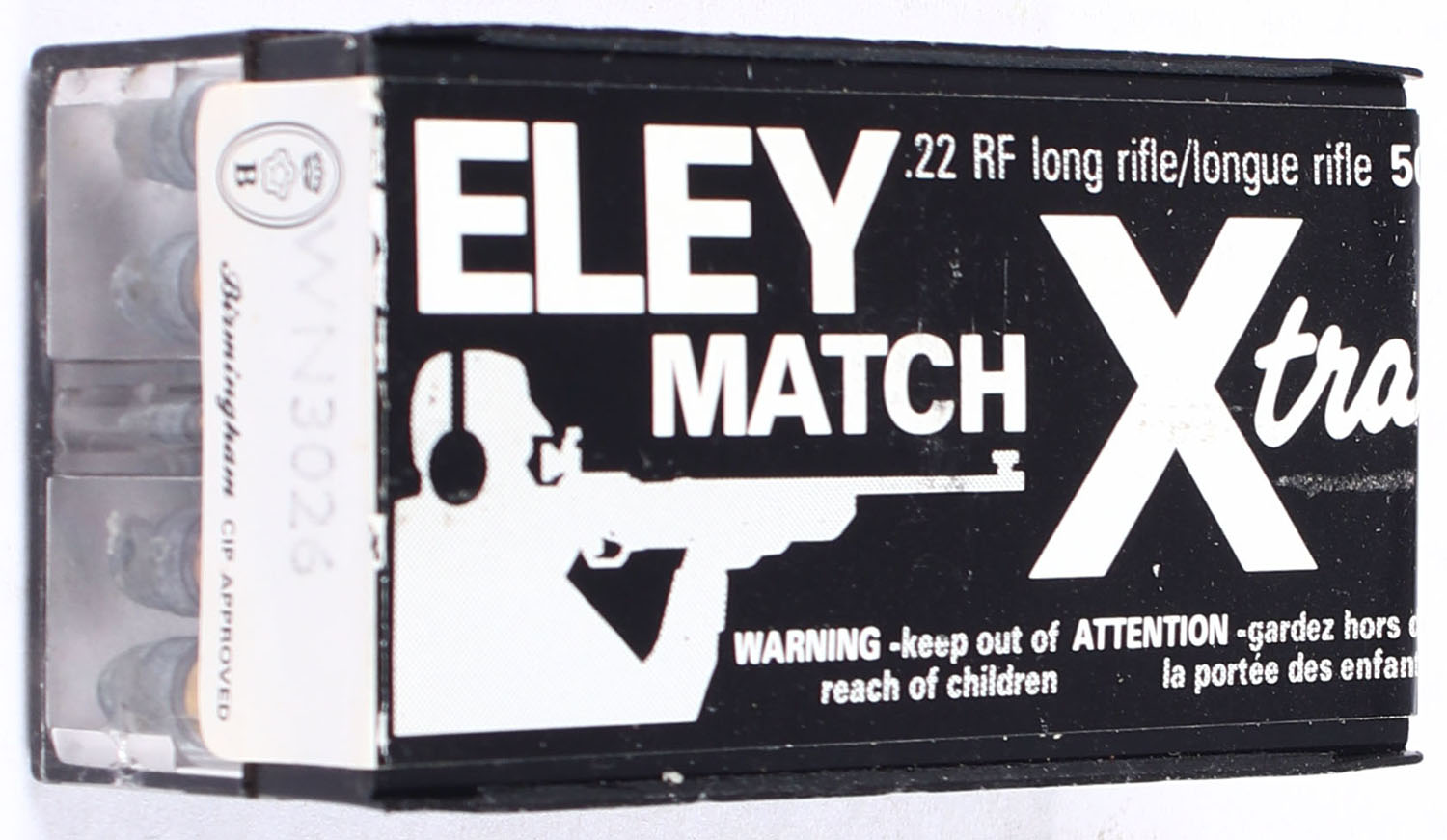 Eley, Match Xtra, .22 Long Rifle, Not in RHWeb, FULL & SEALED, 2pc. Clear plastic tray with black sealing label, box is near mint with minty color, only very minor shelf wear, label is intact, ammo appears excellent. Grade: Excellent ++ - Value: 6 to 10