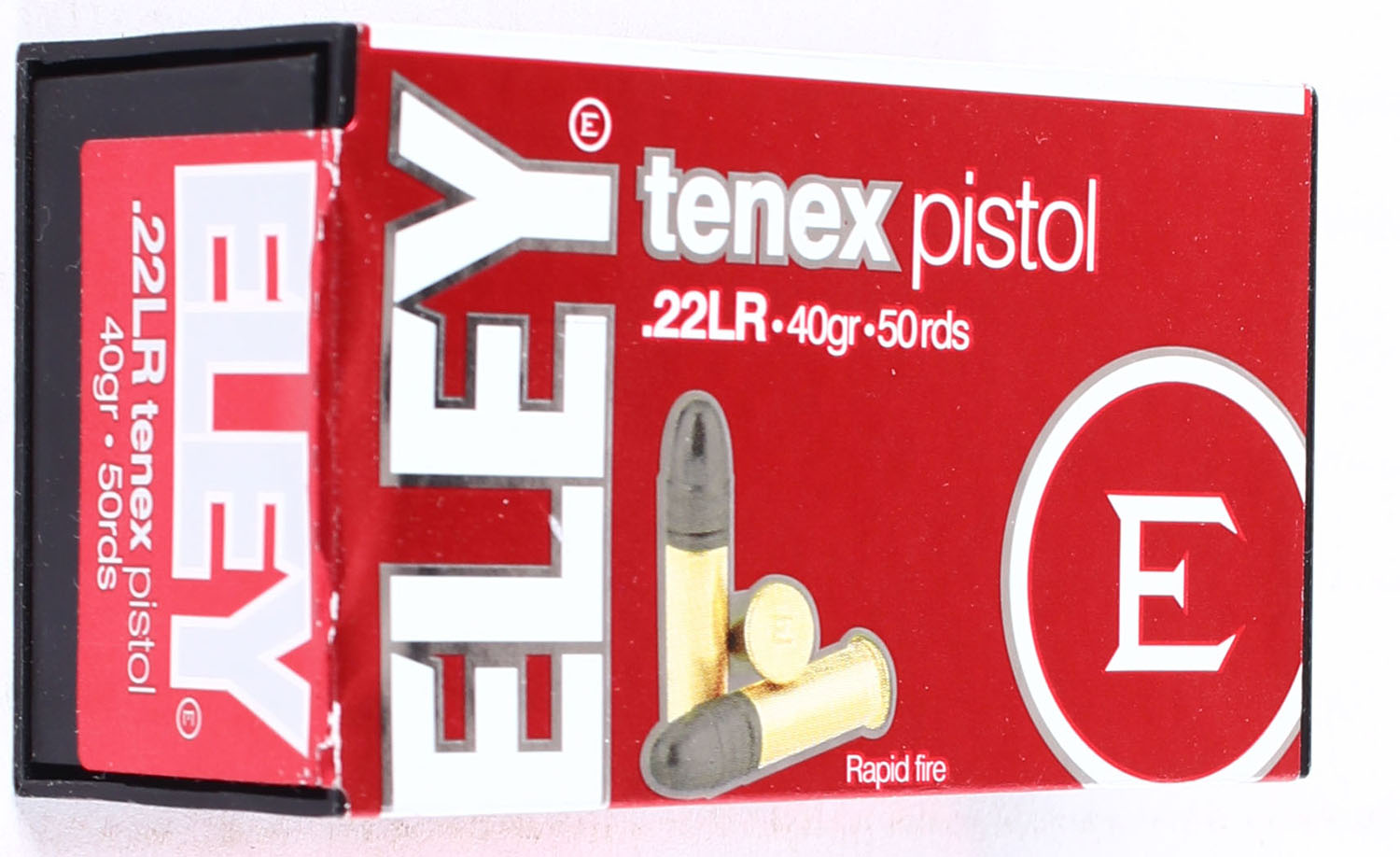 Eley, tenex pistol, .22 Long Rifle, 40 Grain, Not in RHWeb, FULL & SEALED, 2pc. Black plastic tray with red sealing label, box is MINT with minty color, label is intact. Grade: MINT - Value: 10 to 50
