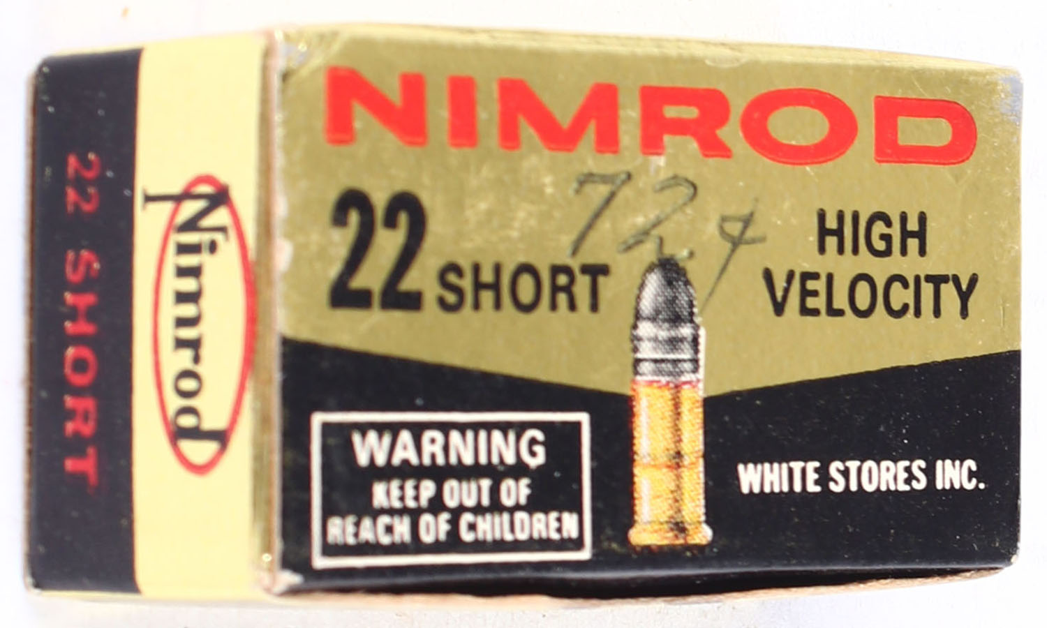 White Stores, Nimrod, .22 Short, High Velocity, RHWEB: WS-1 S-1, Full, 1pc. Gold black & red box, box is solid with minty color, top has been written on, very minor corner wear, edges are crisp, top flap is solid, ammo is minty. Grade: Excellent - Value: 10 to 15