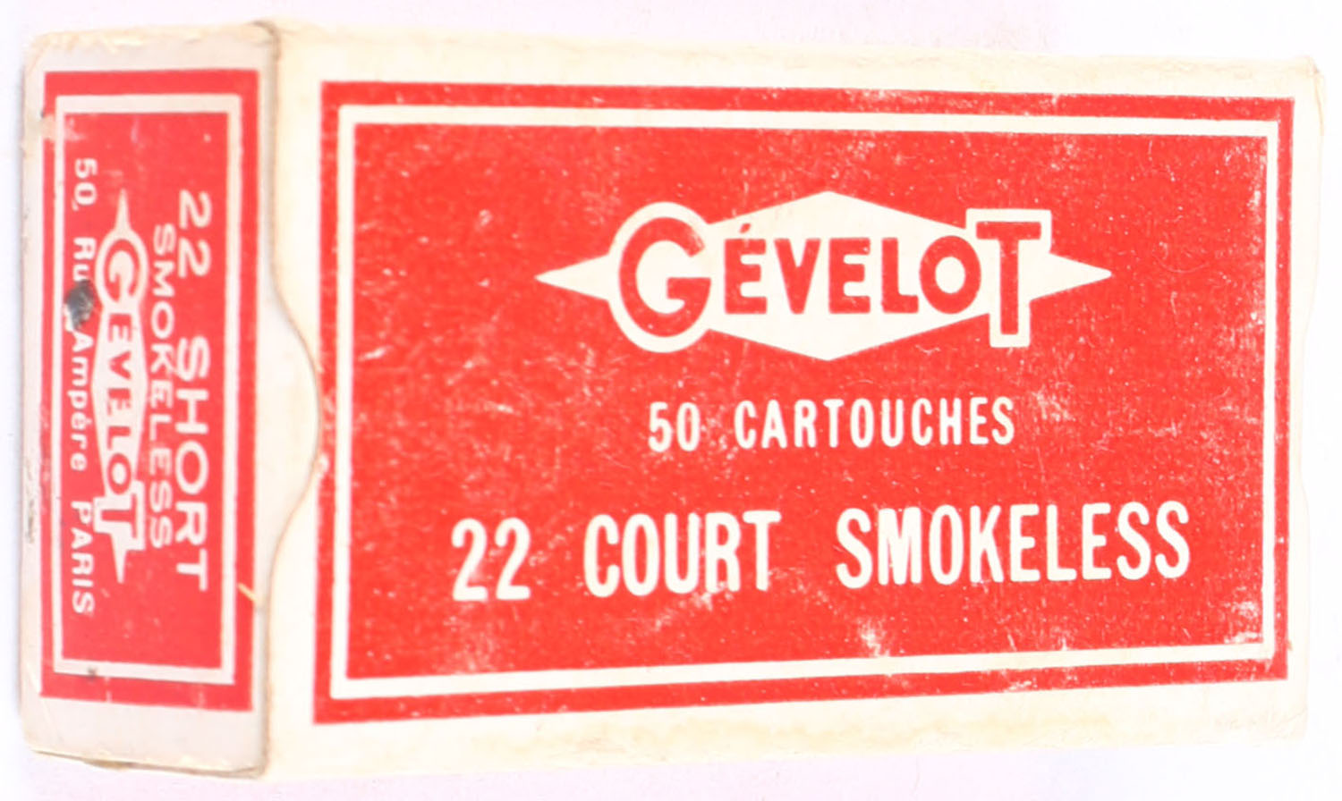 Gevelot, 22 Court Smokeless, .22 Short, Stainless, RHWEB: (France) G-6.5 S-4, Full, 1pc. Red & white box, box is solid with very good color, very minor age soiling & shelf wear, minor edge & corner wear, end flaps are solid, ammo is excellent. Grade: Very Good ++ - Value: 10 to 15