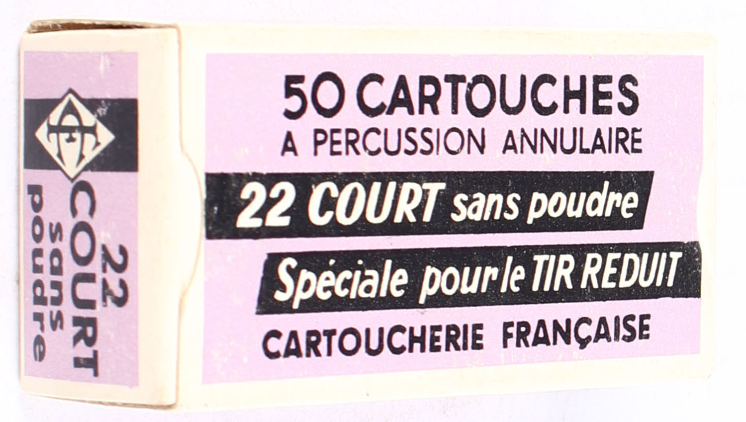 Cartoucherie Francaise, Sans Poudre, .22 Short Powderless, RHWEB: (France) CF-5 S-6 Full, 1pc. Purple white & black box, box is solid with excellent color, very minor shelf wear, corners are mostly sharp, edges are crisp, end flaps are solid, ammo is excellent. Grade: Excellent - Value: 10 to 15