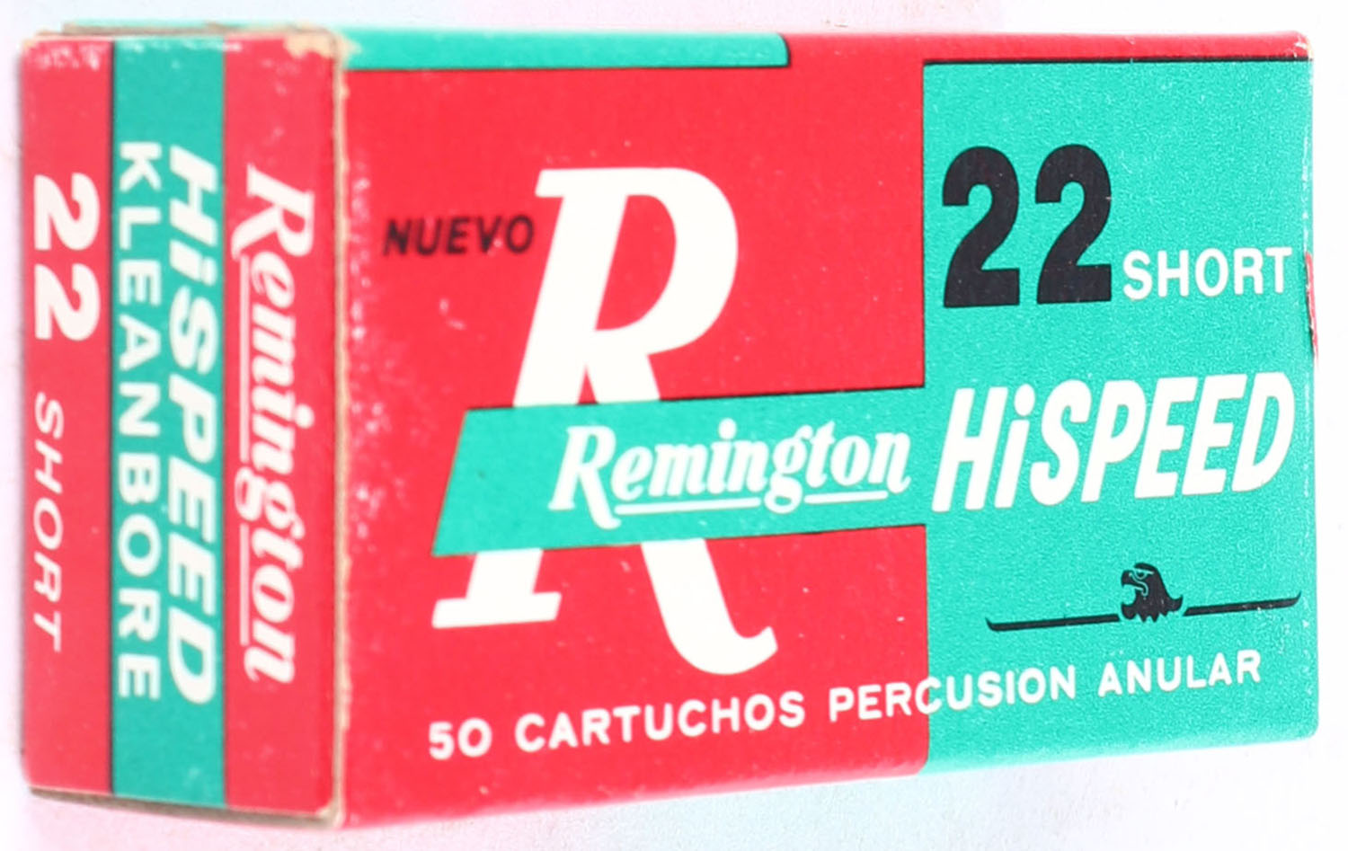 Remington, Nuevo HiSpeed, .22 Short, RHWEB: (Mexico) cdmREM-1 S-2a, Full, 1pc. Red green & white box, box is near mint with minty color, only very minor shelf wear, corners are mostly sharp, edges are crisp, end flaps are solid, ammo is excellent. Grade: Excellent ++ - Value: 16 to 24
