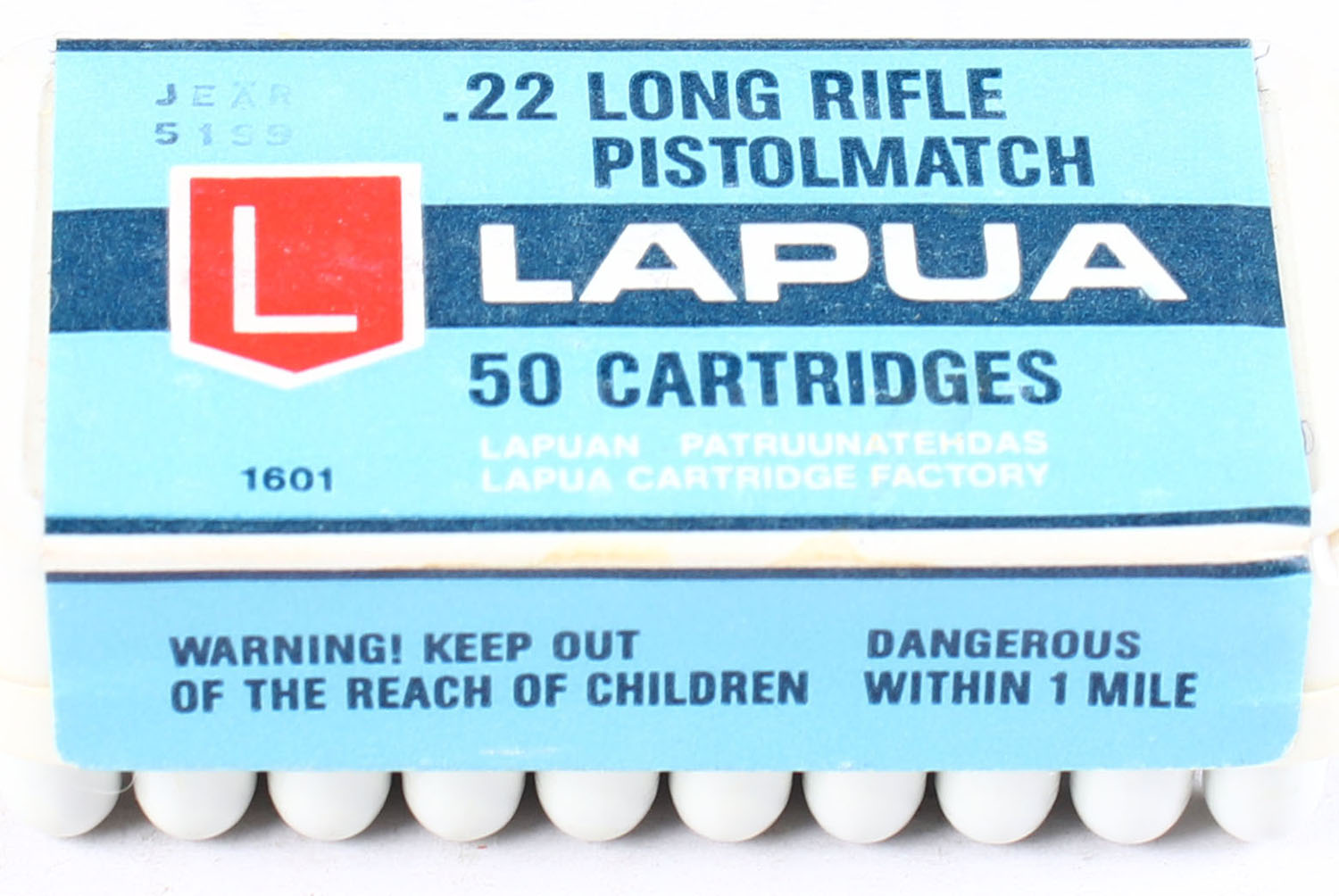 Lapua, Pistolmatch, .22 Long Rifle, RHWeb: (Finland) L-4 LR-8, FULL & SEALED, 2pc. White egg carton style plastic box with blue white & red sealing label, box is MINT with minty color, label is intact. Grade: MINT - Value: 20 to 30