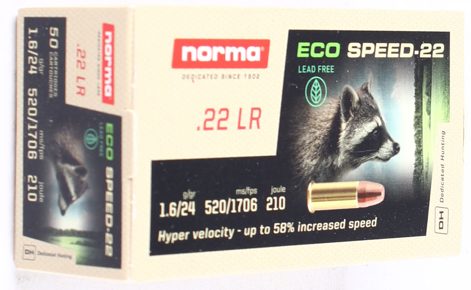 Norma, Eco Speed-22, .22 Long Rifle, Lead Free, Hyper Velocity, Not in RHWeb, Full, 1pc. Tan box featuring raccoon, box is MINT with mint color, corners are sharp, edges are crisp, end flaps are solid, ammo is minty. Grade: MINT - Value: 12 to 18