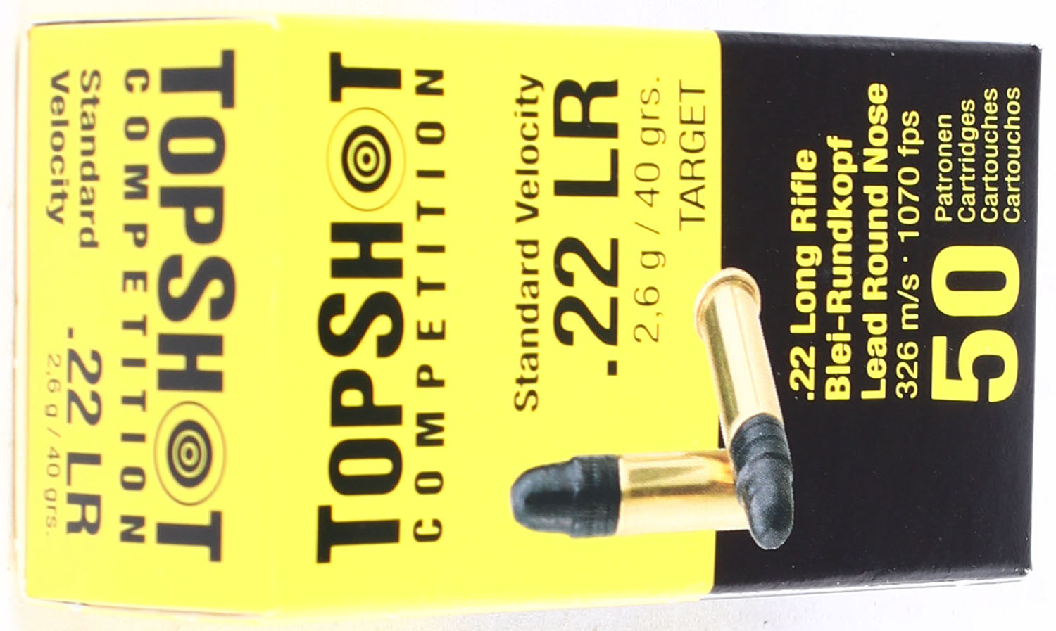 TopShot, Competition, .22 Long Rifle, Standard Velocity, 40 Grain Lead Round Nose, RHWeb: (Germany) MISC-99 LR-9b, Full, 1pc. Yellow & black box, box is MINT with minty color, corners are sharp, edges are crisp, end flaps are solid, ammo is mint. Grade: MINT - Value: 10 to 15