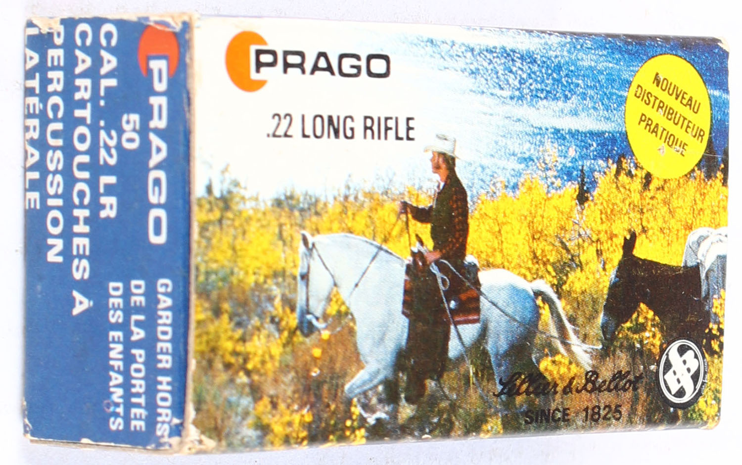 Sellier & Bellot, Prago, .22 Long Rifle, RHWeb: (Czechoslovakia) MISC-1 LR-2, Full, 1pc. Multi-colored box, box is near mint with minty color, very minor corner wear, edges are crisp, end flaps are solid, ammo is minty. Grade: Excellent ++ - Value: 50 to 100