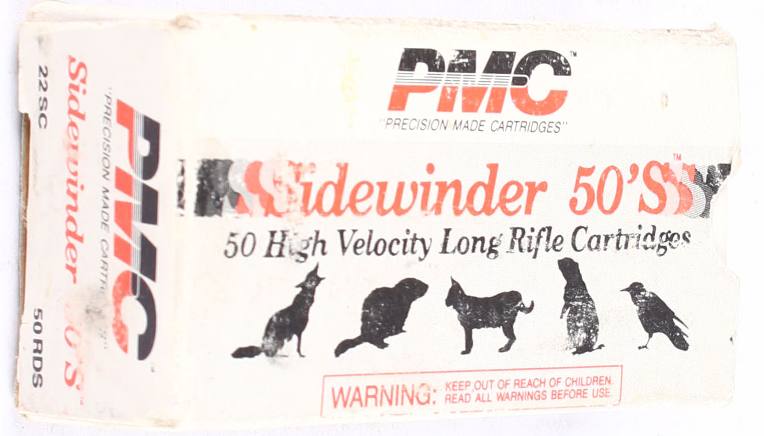 PMC, Sidewinder 50's, .22 Long Rifle, High Velocity, RHWeb: PMC-3 LR-2.5, Partial 49rds. 1pc. Gray white & red box, box is solid with very good color, some shelf wear, minor age soiling, some edge & corner wear, end flaps are solid, ammo is excellent. Grade: Very Good - Value: 6 to 10