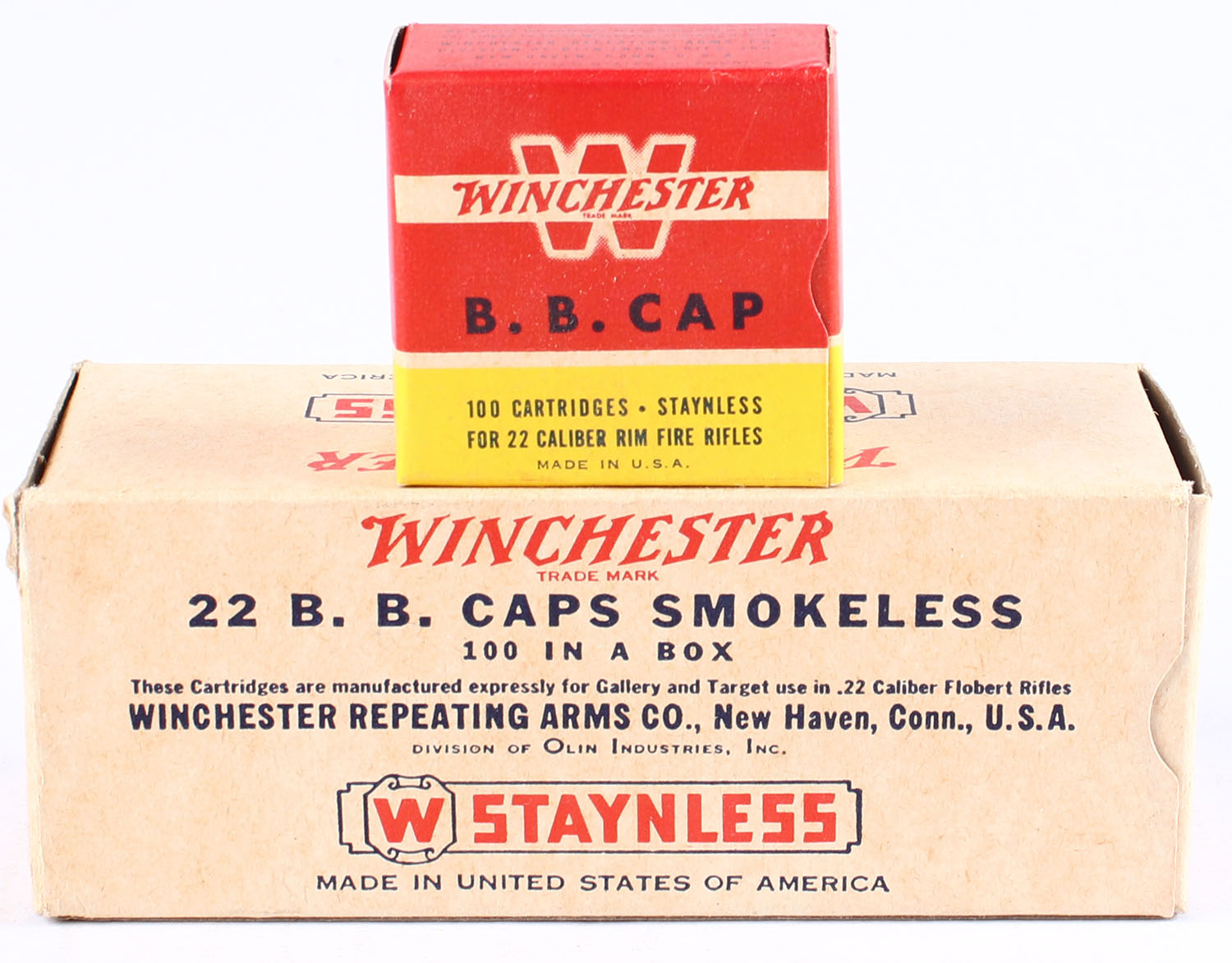 Winchester, Staynless, .22 B.B Caps, Full, 500rds. 1pc., Buff blue & red brick, brick is very solid with minor shelf wear, inside boxes are minty. Grade: Excellent - Value: 60 to 200