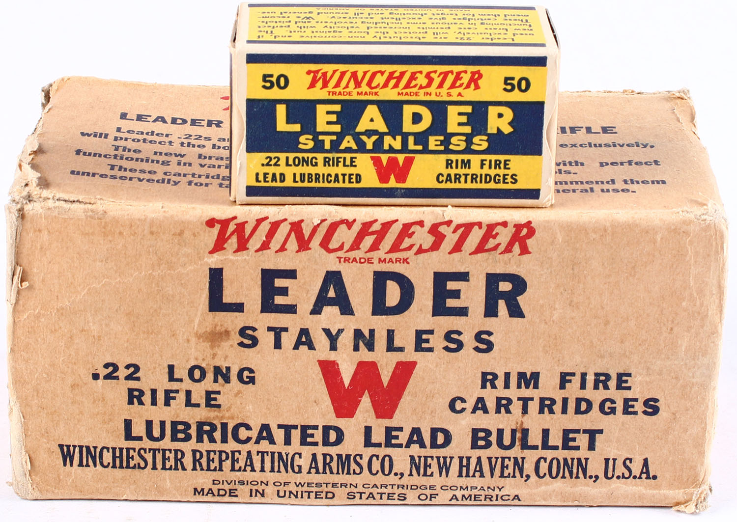 Winchester, Leader Staynless, .22 Long Rifle, Lead Lubricated, Full, 500rds. 1pc. Buff blue & red brick, brick is missing both end flaps, has edge & corner wear with a partial seam split to bottom, inside boxes are very good. Grade: Good ++ - Value: 80 to 240